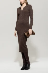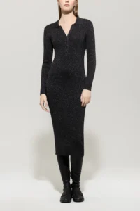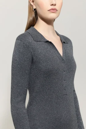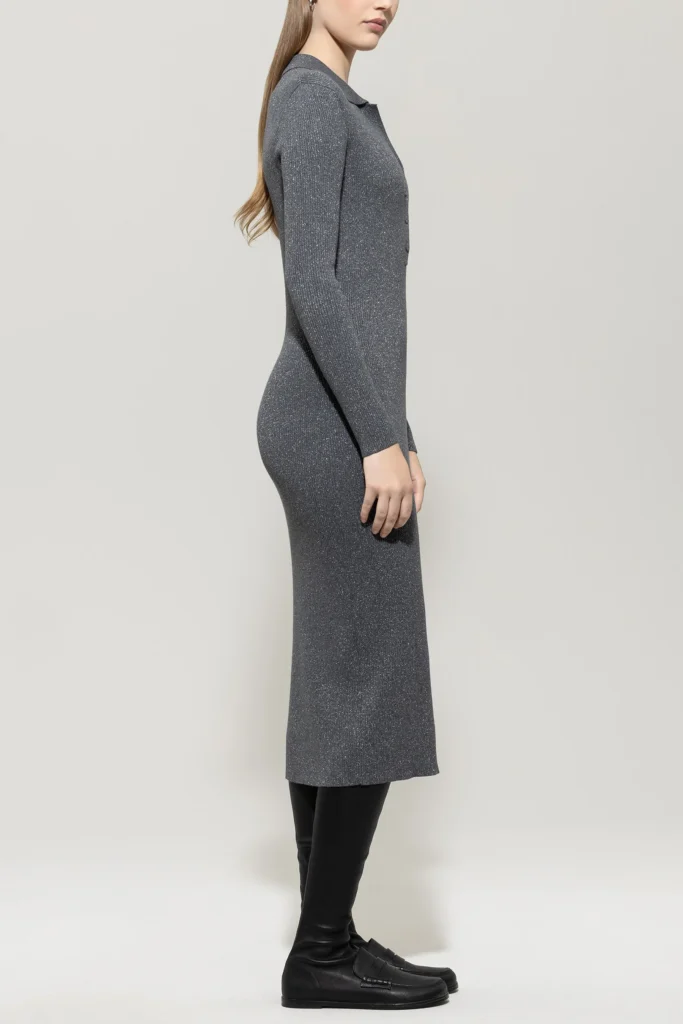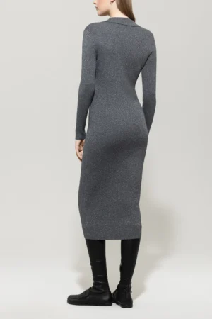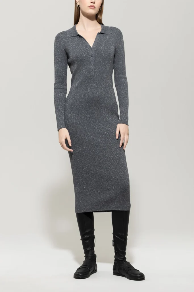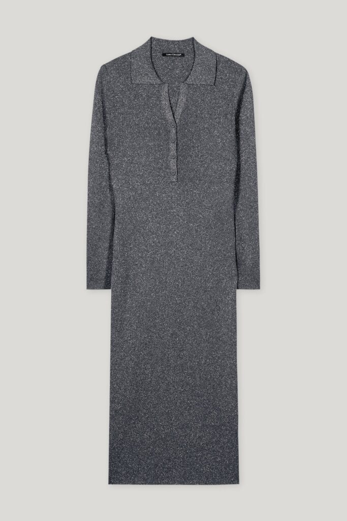 Vācu premium klases apģērbu zīmola Luisa Cerano pieguļoša sieviešu kleita pelēkā krāsā ar sudrabainu mirdzumu. Izgatavota no elastīga viskozes maisījuma materiāla ar smalki rievotu tekstūru. Papildināta ar V veida kakla izgriezumu, pogu aizdari un polo apkakli.