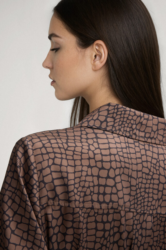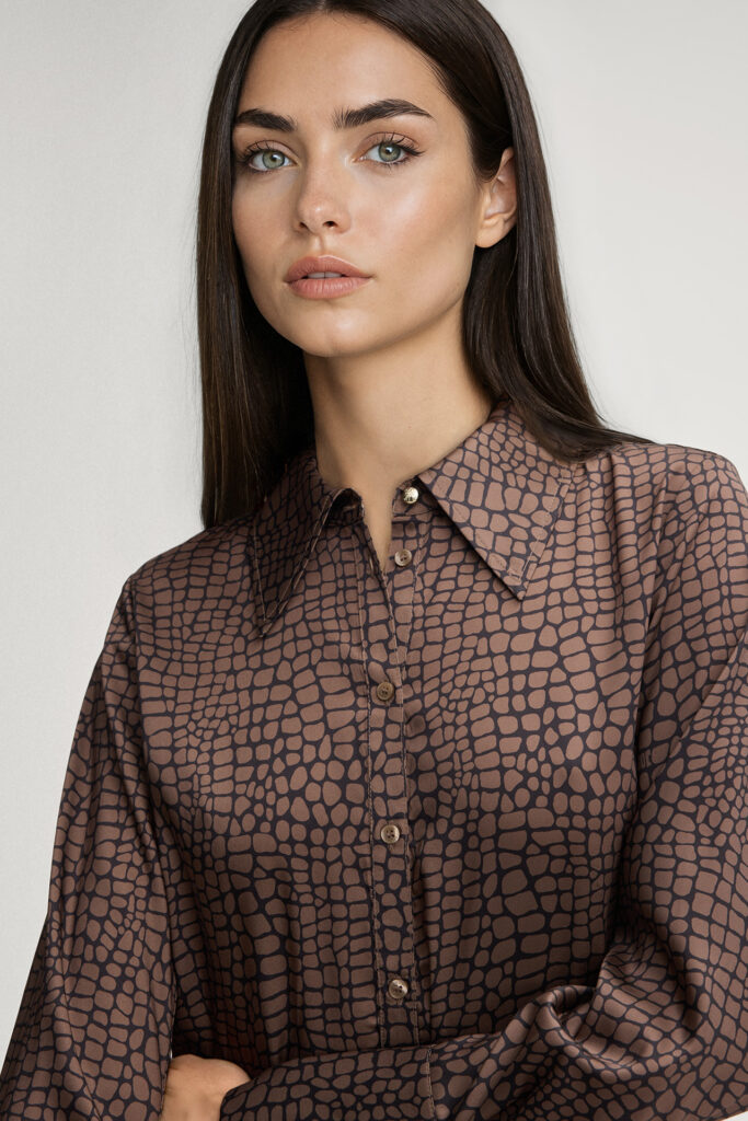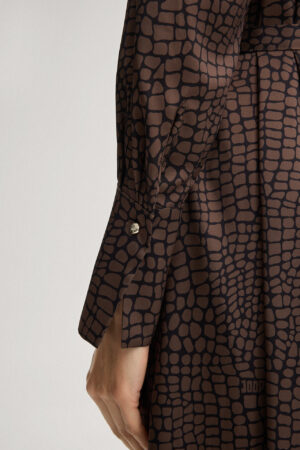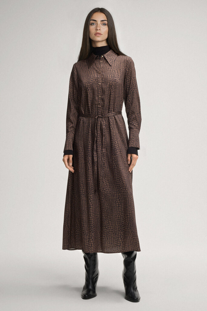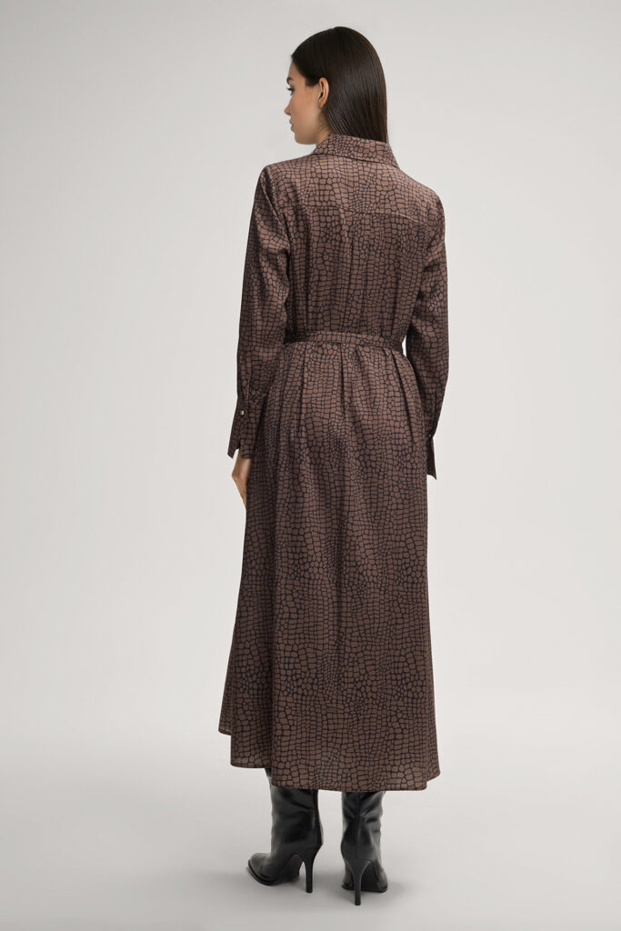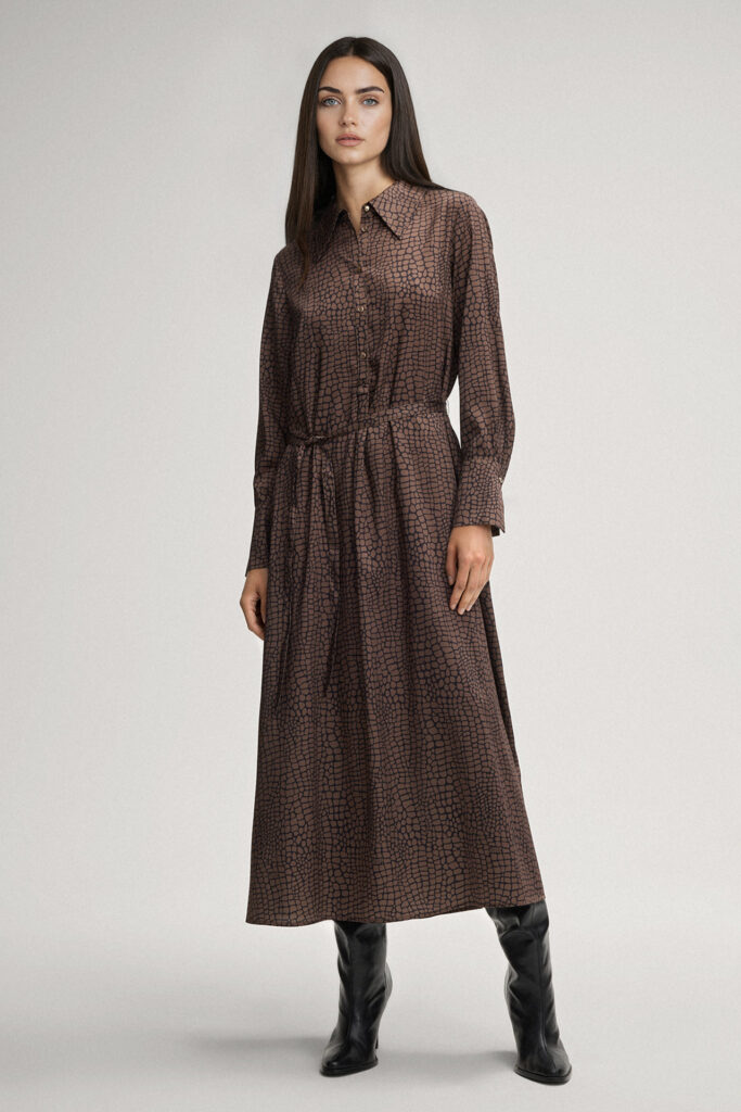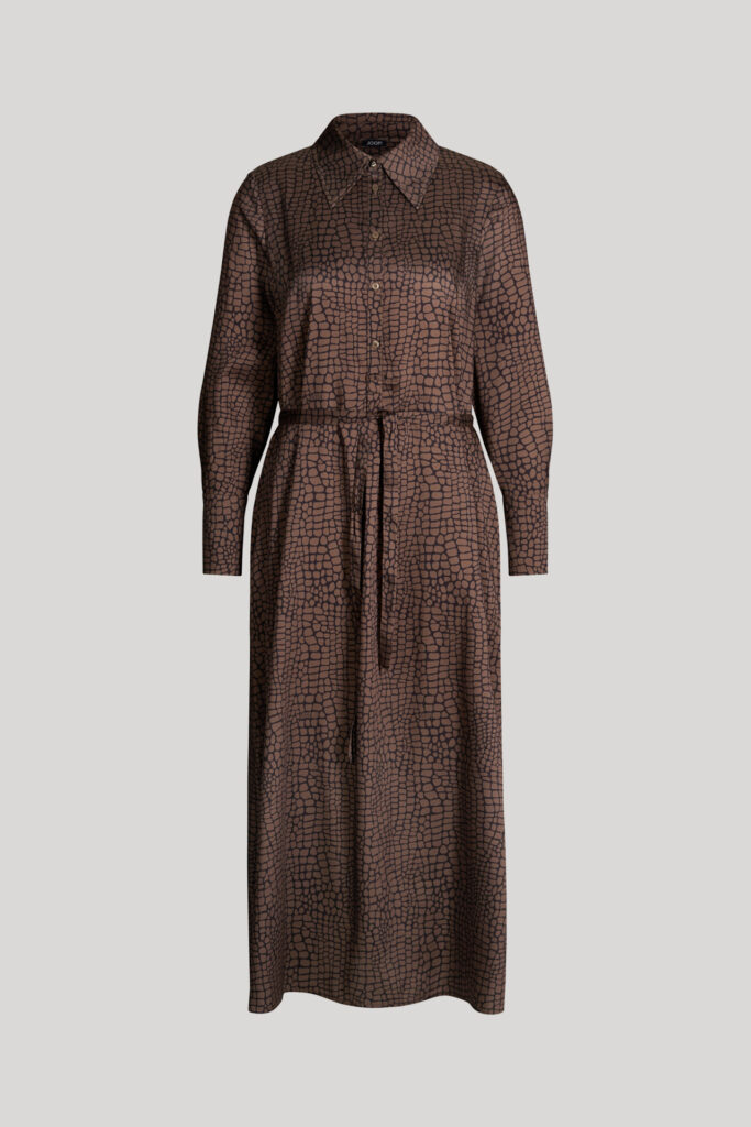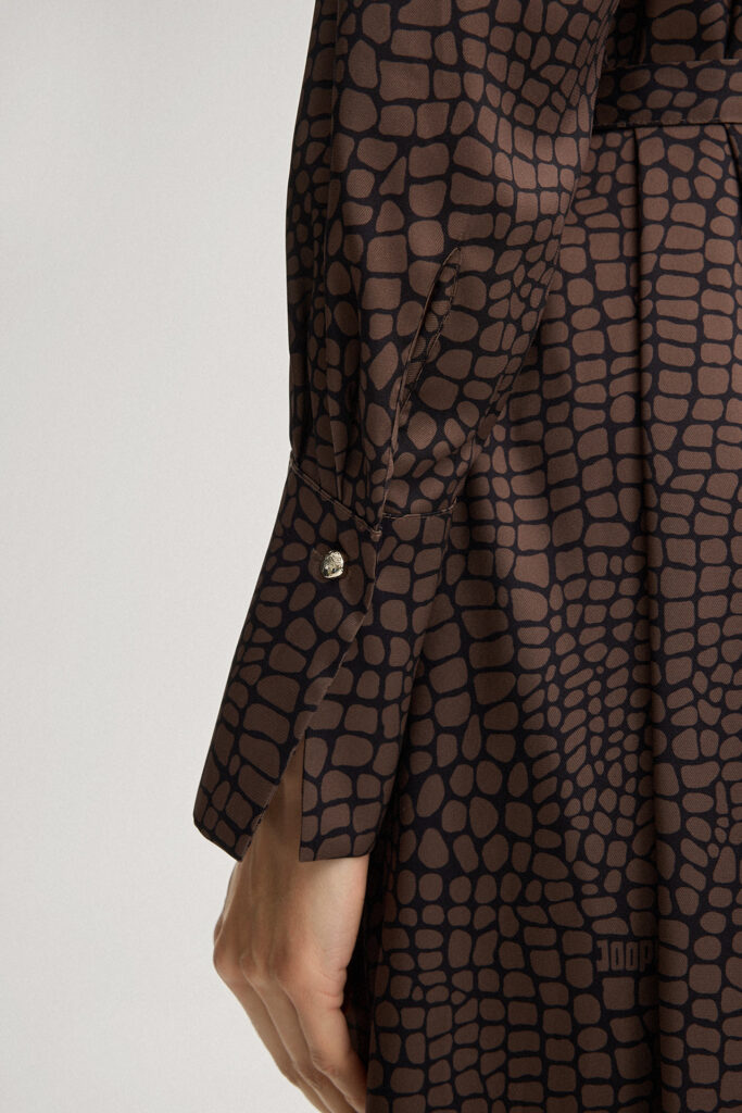Vācu modes zīmola Joop! sieviešu kreklblūzes stila kleita šokolādes brūnā tonī ar melnu korokodilādas imitācijas un logo rakstu. Izgatavota no plūstoša auduma ar satīna struktūru. Papildināta ar zīmola dizaina pogu aizdari un sasienamu jostu, kā arī elegantām aprocēm un iešūtām sānu kabatām.