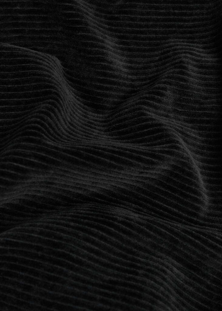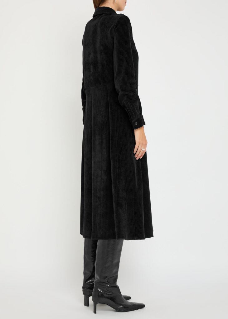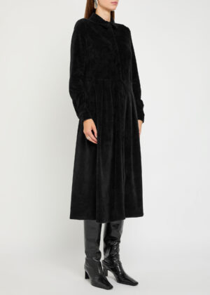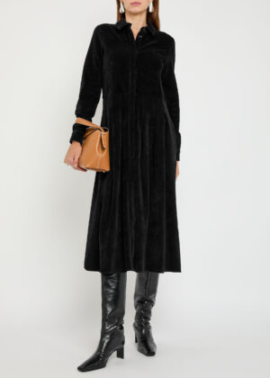 Itāļu modes zīmola MM by Max Mara melna sieviešu kreklveida kleita ar slēptu pogu aizari. Izgatavota no bieza kokvilnas maisījuma velveta auduma ar mīkstu struktūru. Papildināta ar dekoratīvām ielocēm jostasvietā un iešūtām sānu kabatām.