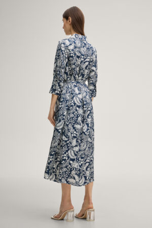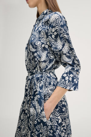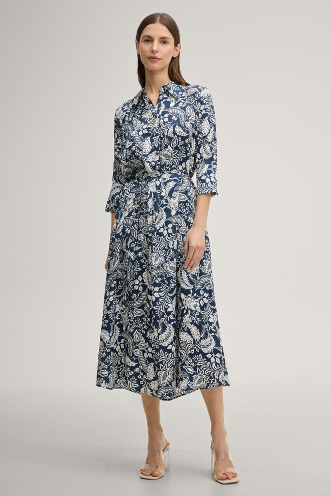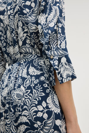 Vācu modes zīmola Joop! tumši zila sieviešu kreklkleita ar kontrastējošu augu motīvu apdruku un sasienamu jostu. Izgatavota no viegla un plūstoša viskozes auduma ar satīna struktūru. Papildināta ar zīmola pogu aizdari, saīsināta garuma piedurknēm un elegantām aprocēm, kā arī iešūtām sānu kabatām. Akcentēta ar zelta krāsas metāla un zīmola logotipa detaļām.