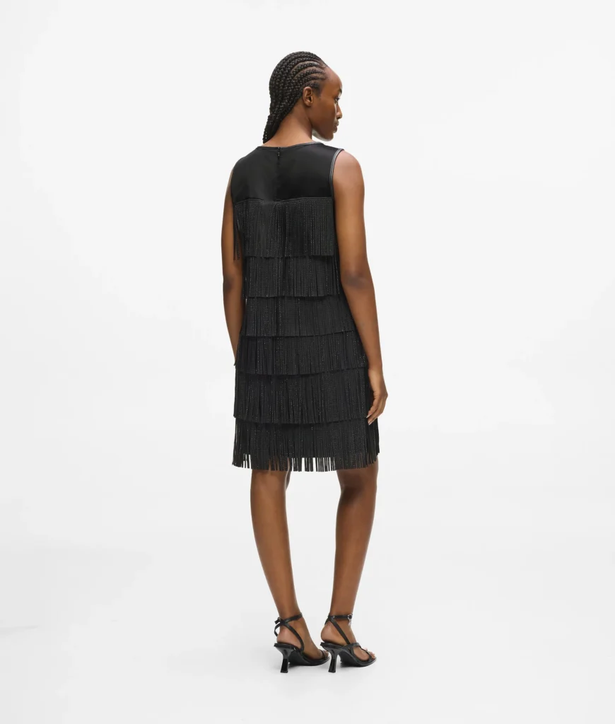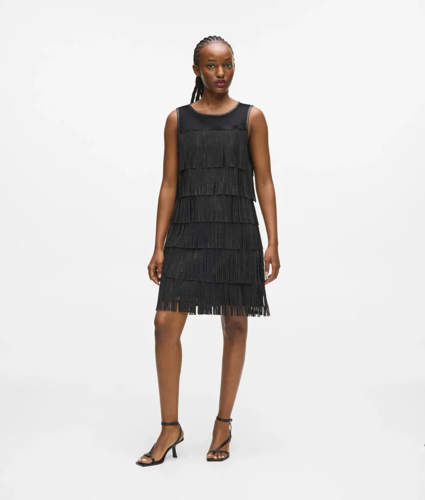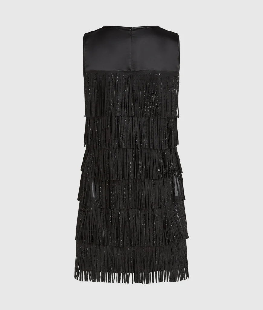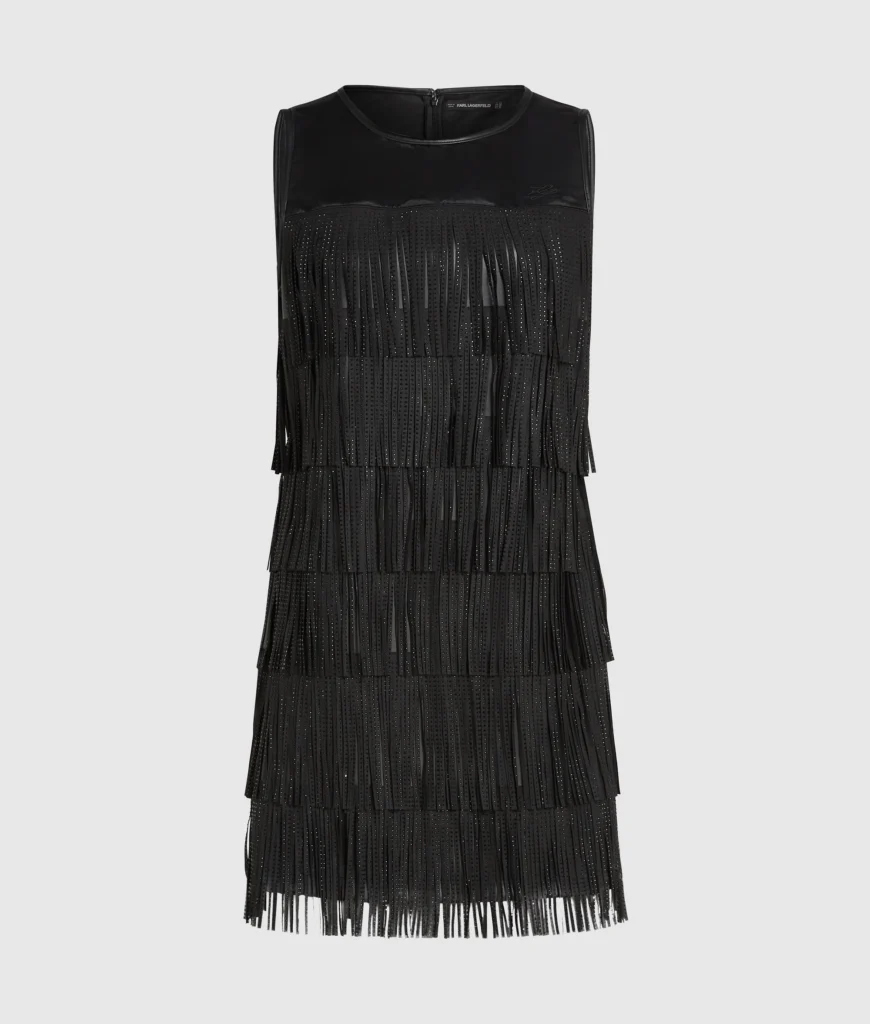 Vācu luksusa zīmola Karl Lagerfeld melna sieviešu mini kleita bez piedurknēm. Izgatavota no ādas imitācijas un satīna materiāliem ar zamšādas skaru un melni mirdzošu kristālu pārklājumu. Akcentēta ar smalku Autograph logotipa izšuvumu.