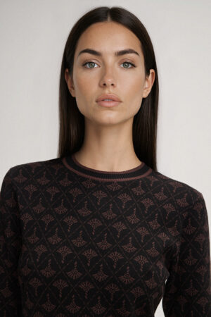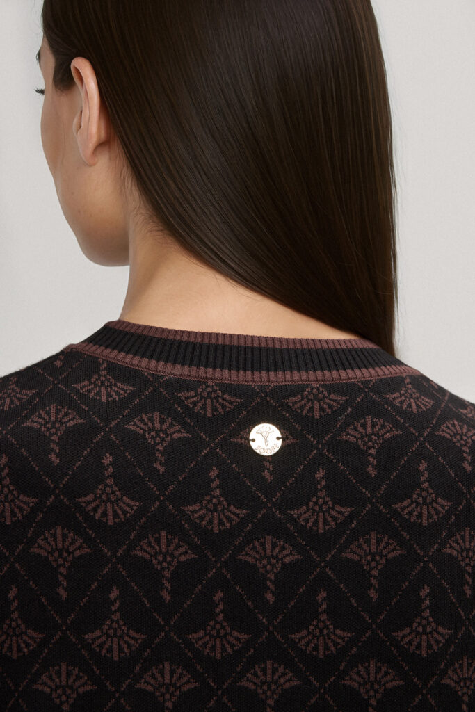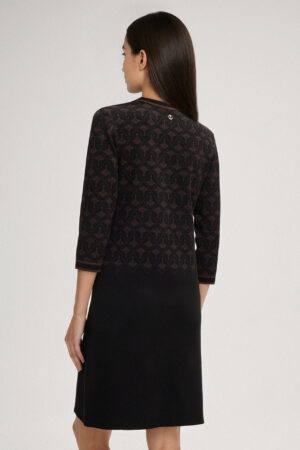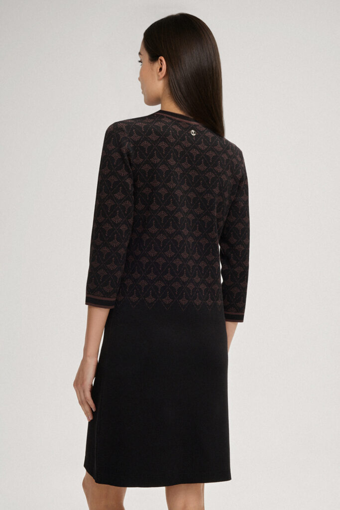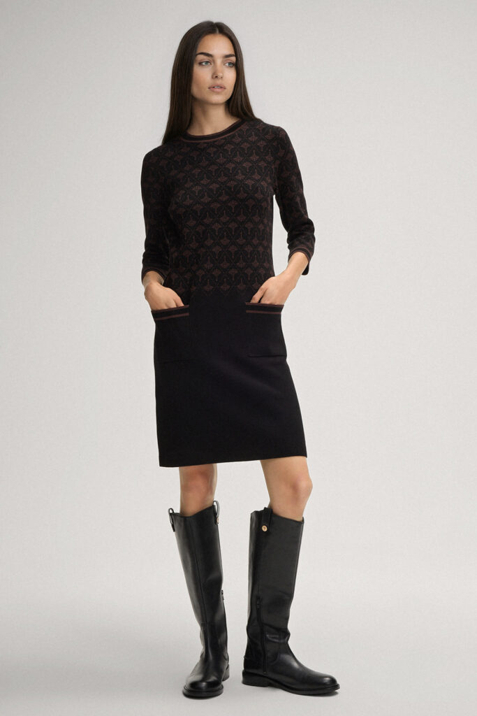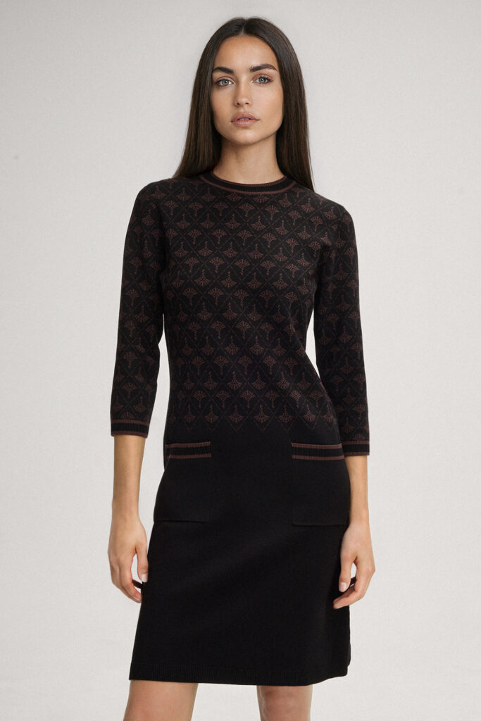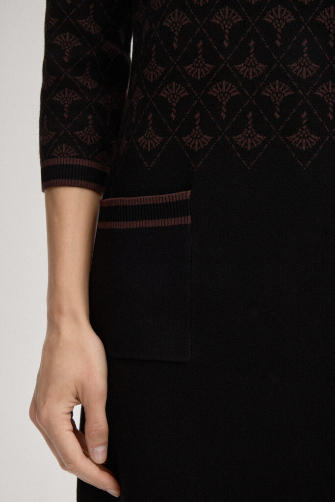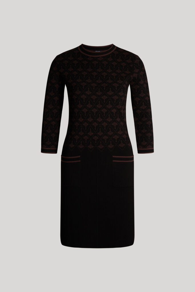 Vācu modes zīmola Joop! adīta sieviešu kleita melnā krāsā ar šokolādes brūnu rudzupuķu rakstu. Izgatavota no mīksta viskozes maisījuma materiāla. Papildināta ar saīsināta garuma piedurknēm un uzšūtām kabatām, kā arī smalki rievotu apdari ar svītru akcentiem un zīmola logotipa akcentu mugurpusē.