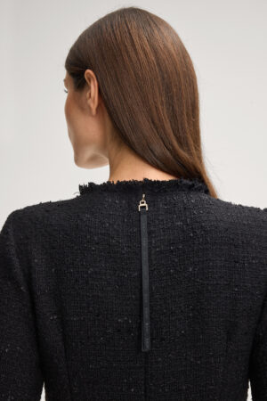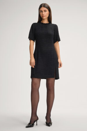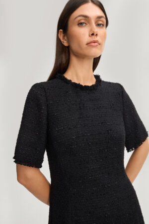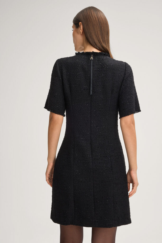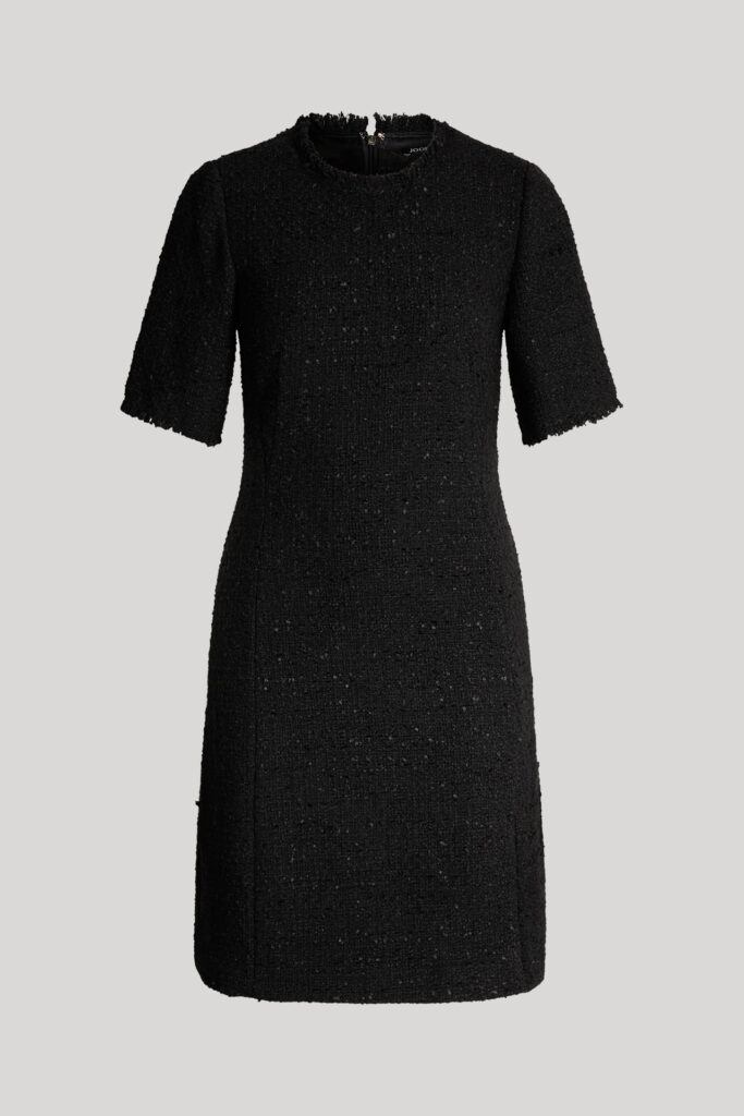 Vācu modes zīmola Joop! melna sieviešu mini kleita ar īsām piedurknēm. Izgatavota no teksturēta buklē auduma ar tvīda struktūru. Papildināta ar oderi un dekoratīvu bārkstveida apdari.