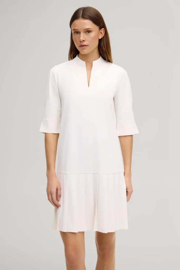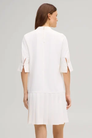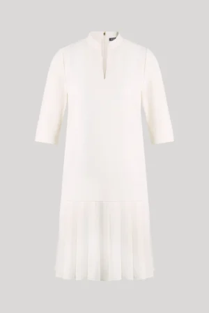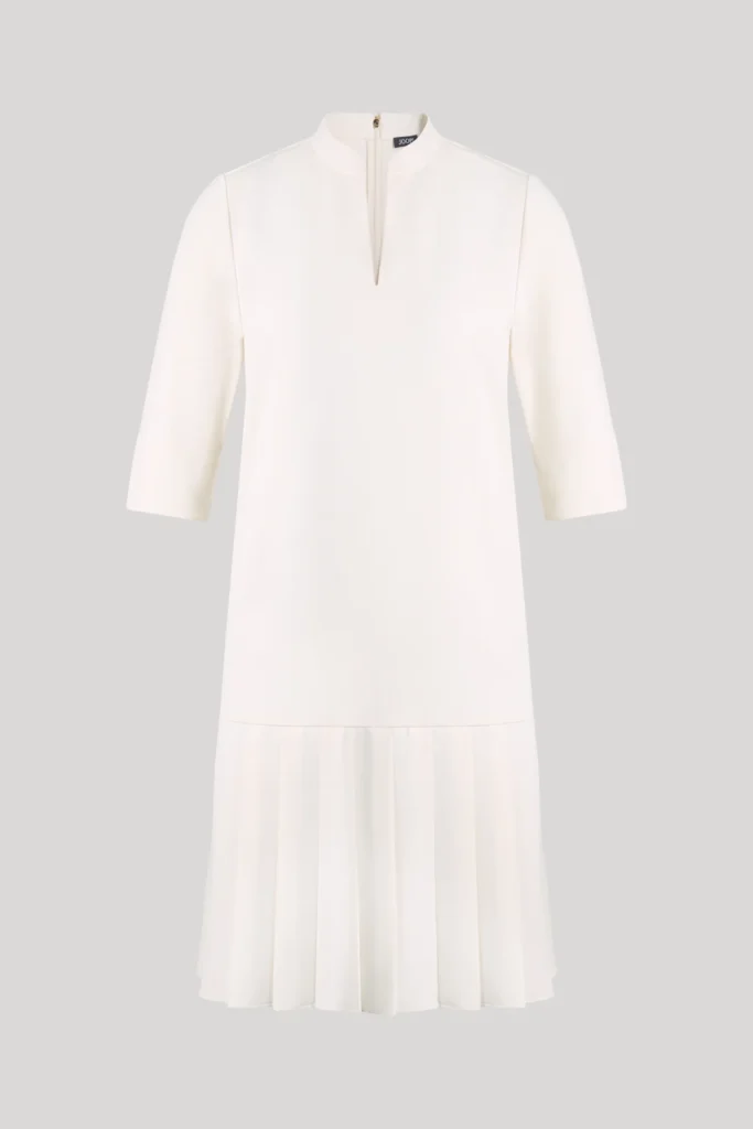 Vācu modes zīmola Joop! krēmbalta sieviešu H silueta kleita ar plisētu apdari svārku daļā. Izgatavota no blīva un elastīga materiāla. Papildināta ar smalku V veida izgriezumu un pusgarām piedurknēm ar šķēlumu aprocēm, kā arī zelta krāsas metāla un zīmola logotipa detaļām.