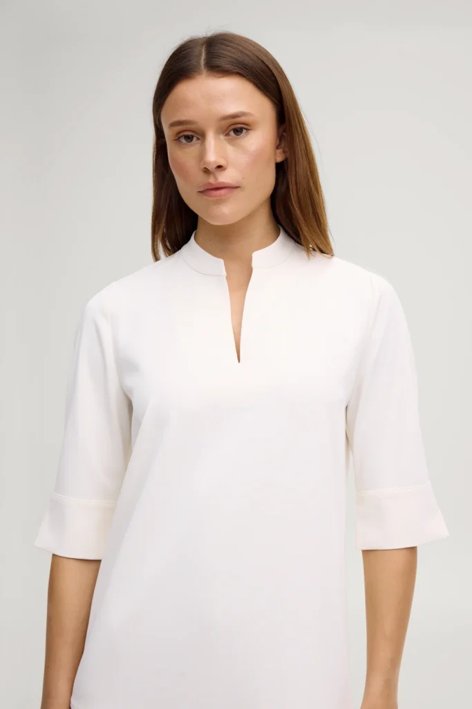 - Apaļš kakla izgriezums ar paaugstinātu apkakli un V veida šķēlumu priekšpusē