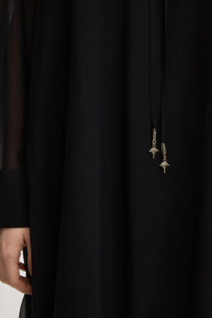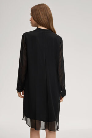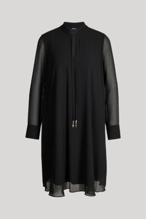 Vācu modes zīmola Joop! gaisīga A silueta sieviešu kleita melnā krāsā. Izgatavota no viegla un caurspīdīga poliestera šifona. Papildināta ar nedaudz paaugstinātu, sasienamu apkakli un ielocēm mugurpusē. Akcentēta ar zelta krāsas zīmola pogām un auklu piekariņiem.