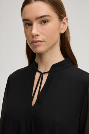 - Apaļš kakla izgriezums ar paaugstinātu, sasienamu apkakli