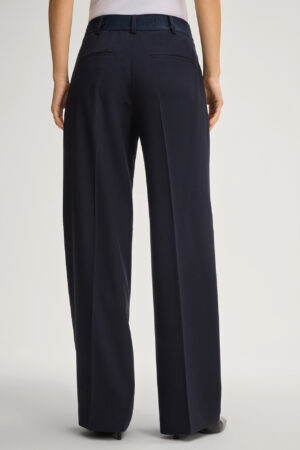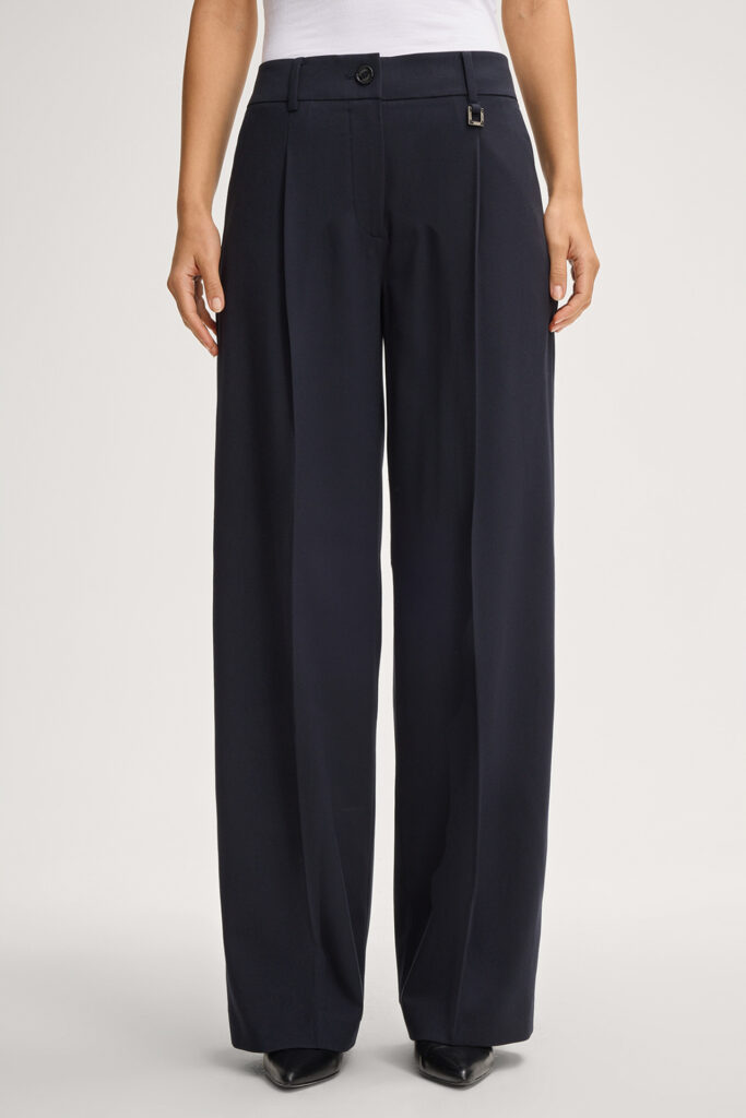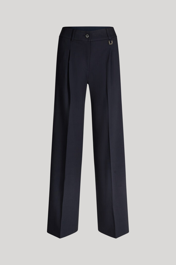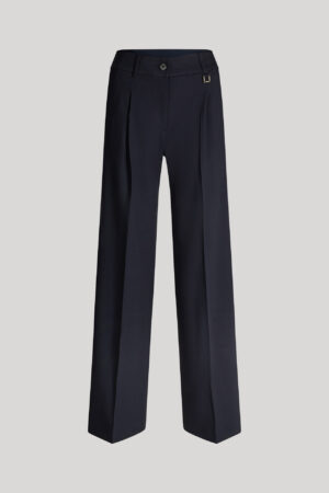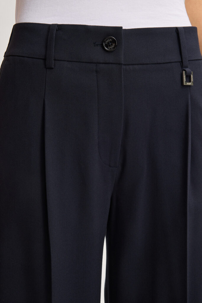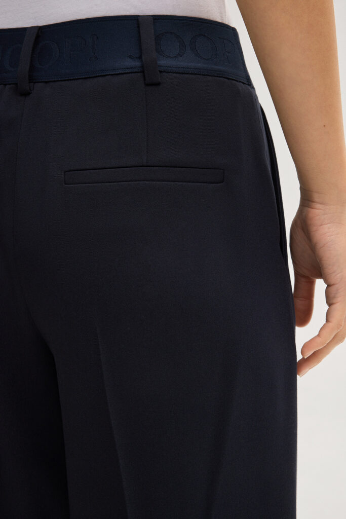 Vācu modes zīmola Joop! tumši zilas sieviešu bikses ar ielocēm un elastīgu zīmola logotipa jostu mugurpusē, ko papildina zelta krāsas metāla kulons ar logo gravējumu pie jostas cilpas.