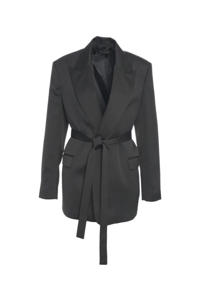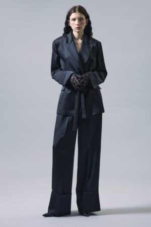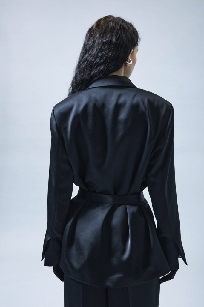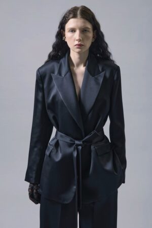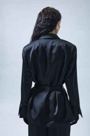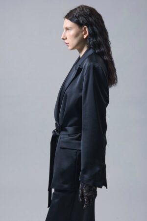 Itāļu modes zīmola KAOS eleganta un izsmalcināta sieviešu žakete ar sasienamu jostu. Izgatavota no melna atlasa auduma ar satīna spīdumu. Papildināta ar smailiem atlokiem, sānu kabatām un šķēlumiem aproču daļā.