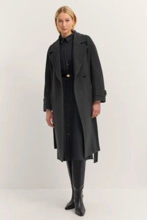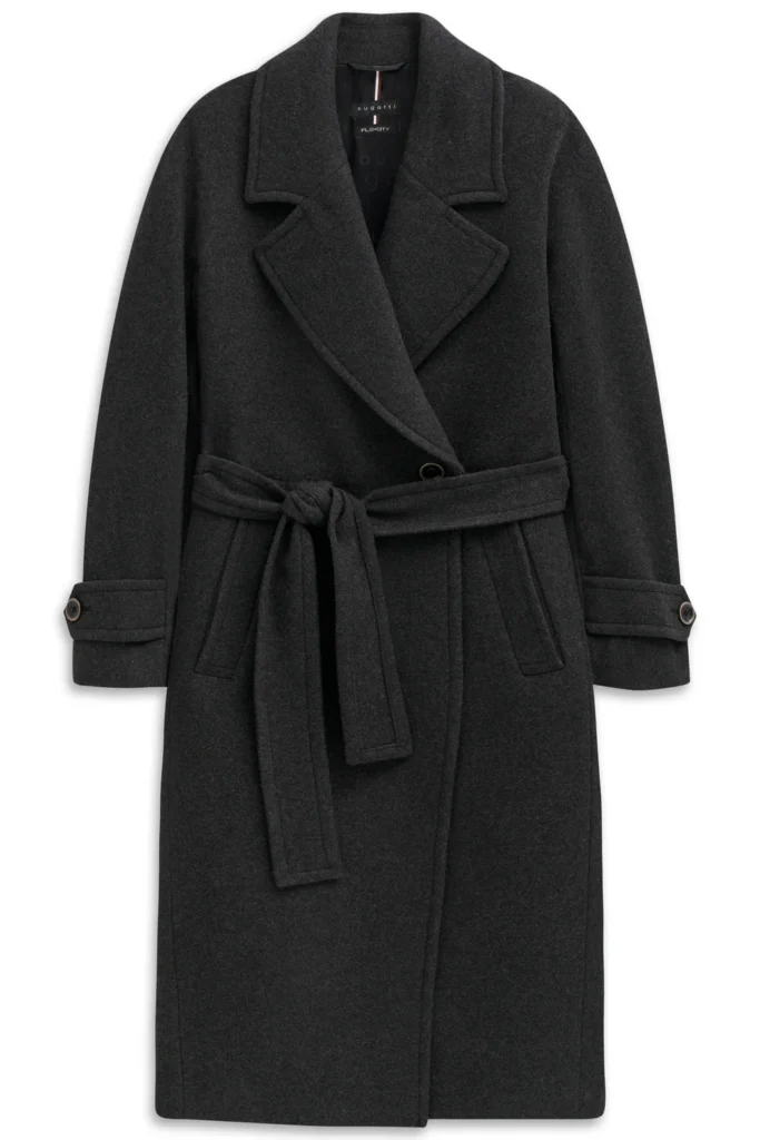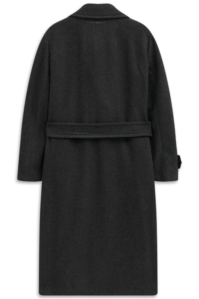 Vācu modes zīmola Bugatti tumši pelēks trenča stila sieviešu mētelis ar sasienamu jostu. Izgatavots no mīksta un bieza vilnas maisījuma auduma. Papildināts ar atlokiem un divrindu pogu aizdari, kā arī smalku zīmola logotipa metāla akcentu mugurpusē.