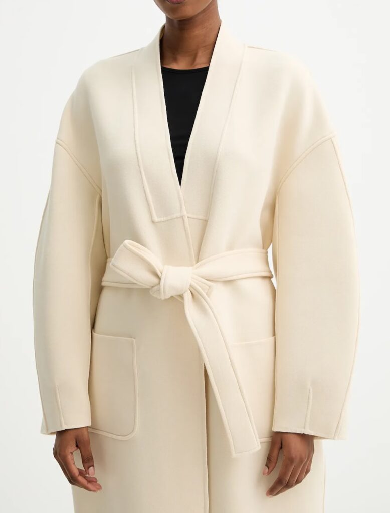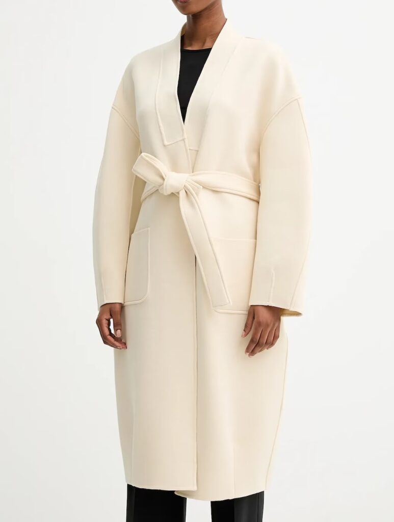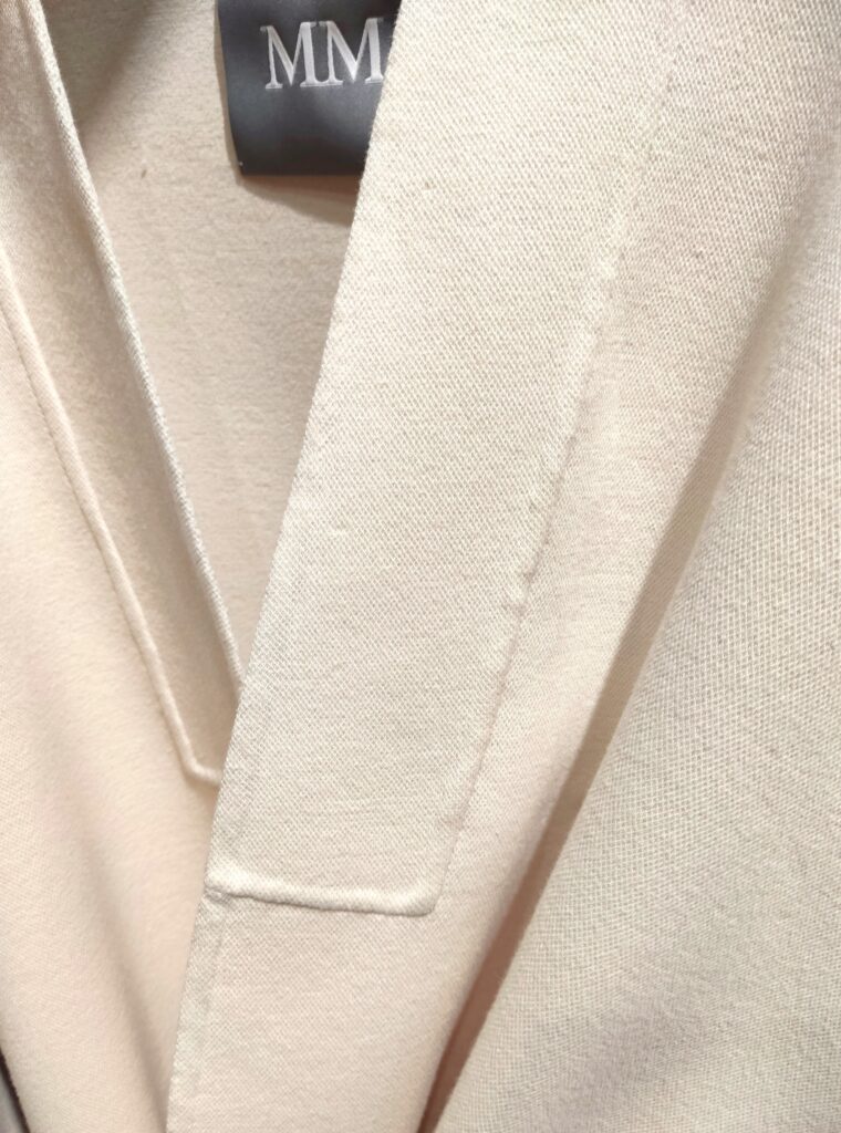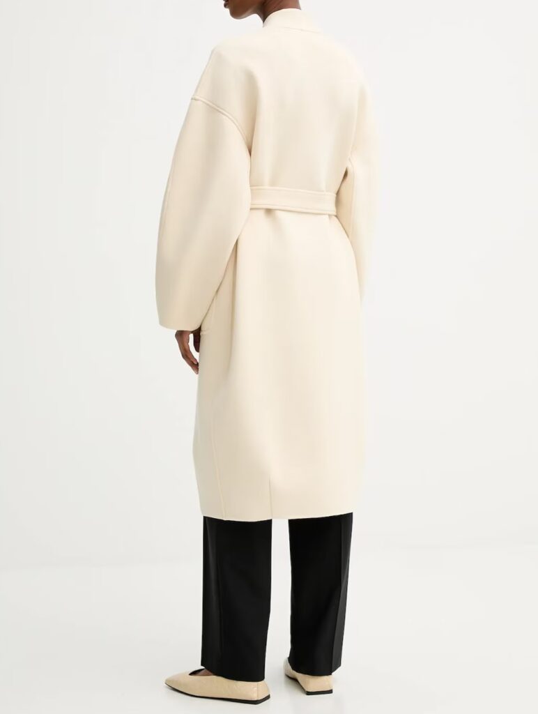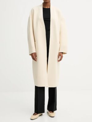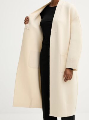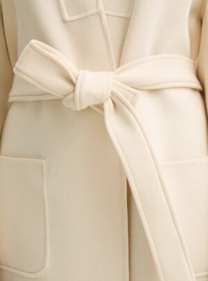 Itāļu modes zīmola MM by Max Mara gaiši bēšs sieviešu halātveida mētelis ar noapaļota dizaina piegriezumu. Izgatavots no blīva un bieza kokvilnas maisījuma materiāla. Papildināts ar uzšūtām sānu kabatām un sasienamu jostu.