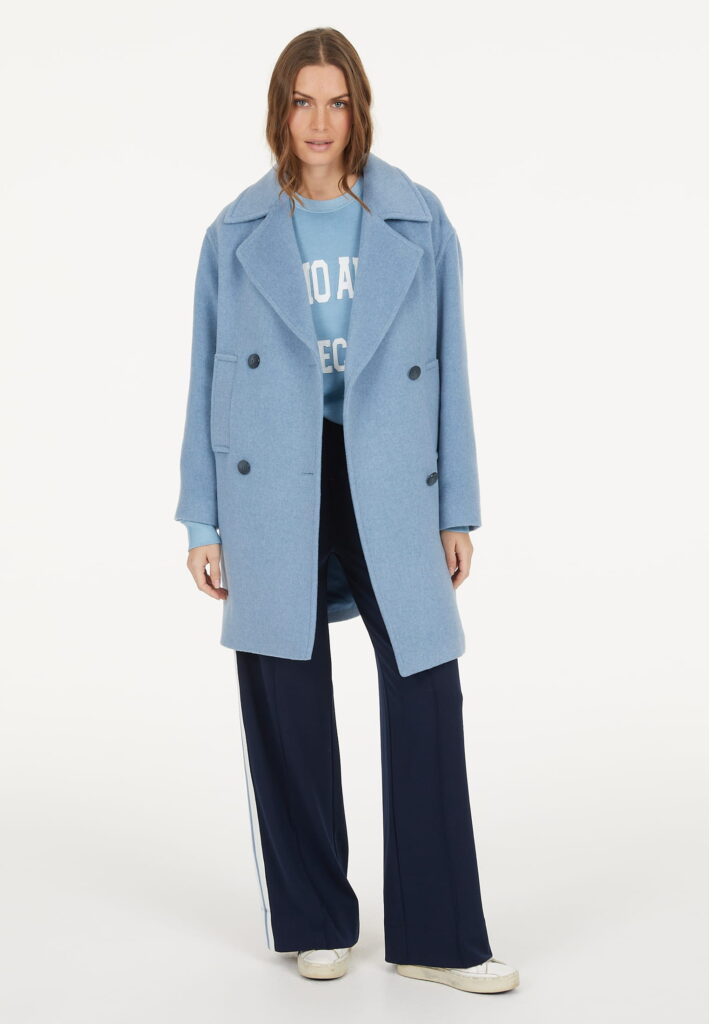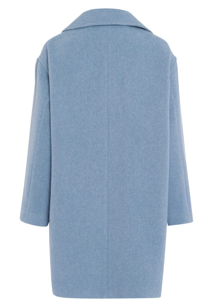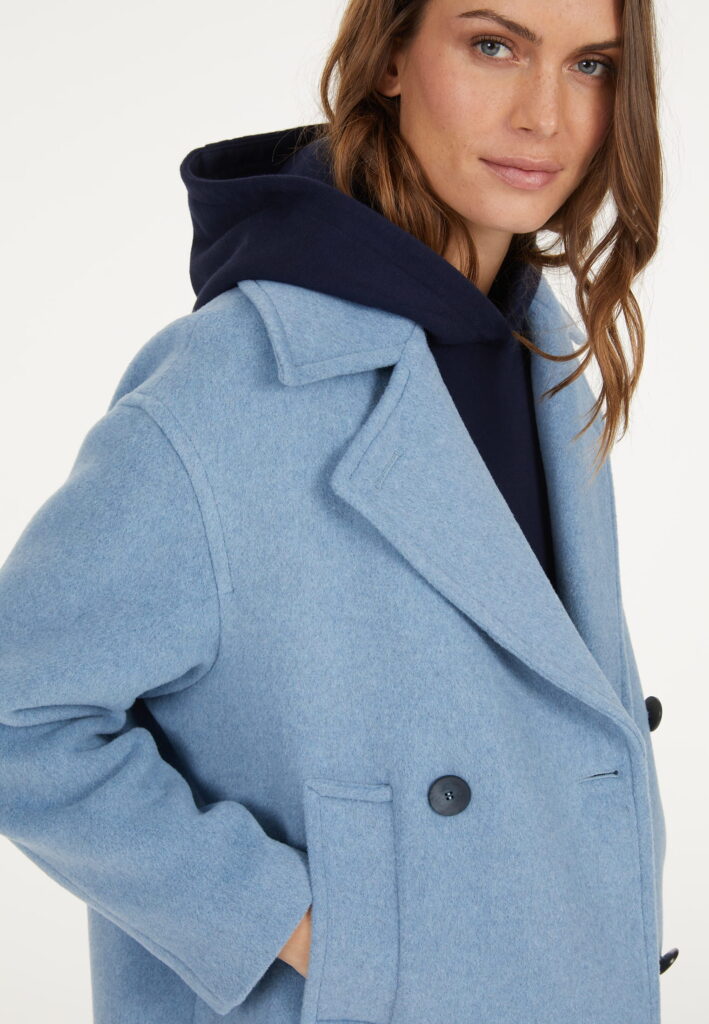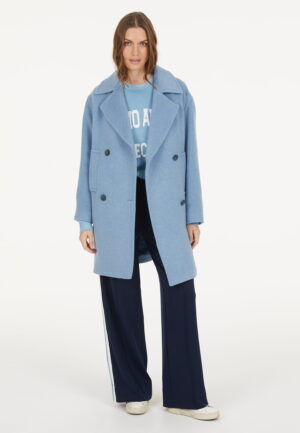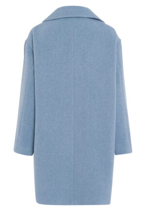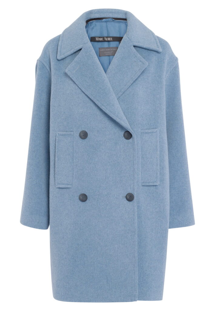 Vācu modes zīmola Marc Aurel universāls un elegants sieviešu mētelis ar klasiskiem atlokiem debeszilā krāsā. Izgatavots no Itālijā ražota vilnas maisījuma auduma. Papildināts ar kontrastējošu divrindu pogu aizdari un sānu kabatām.
