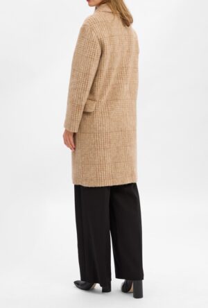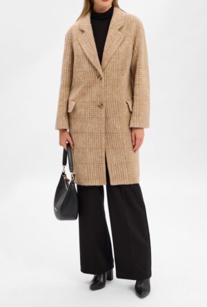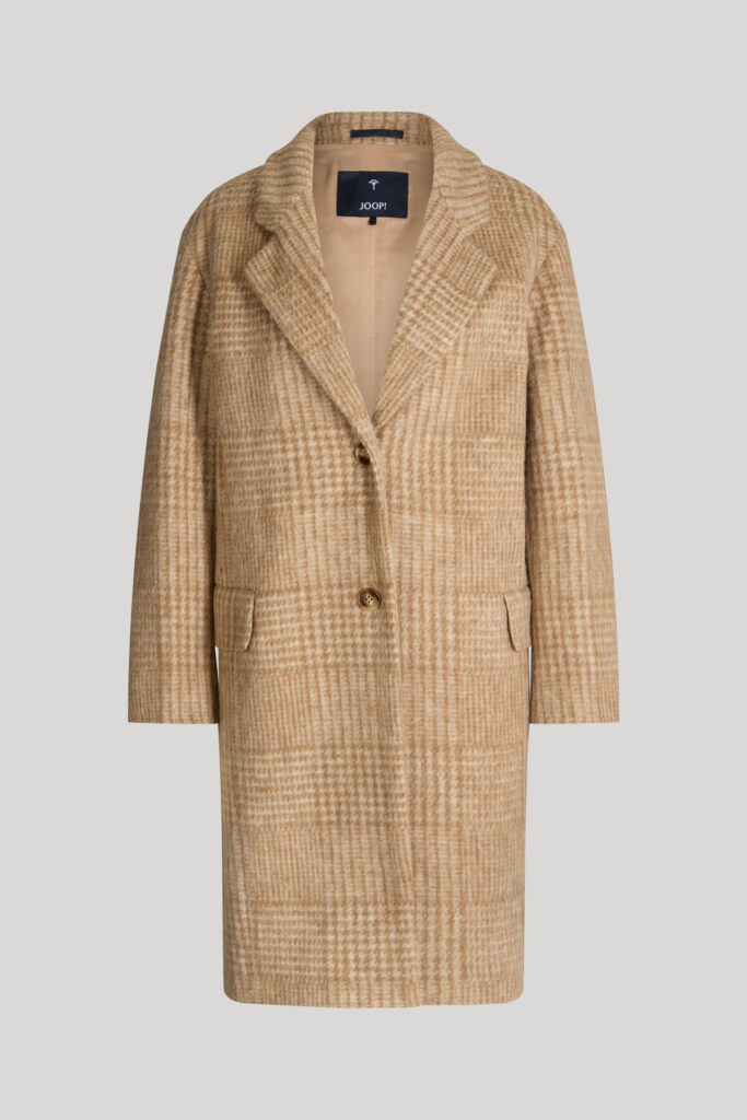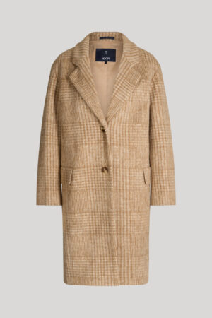 Vācu modes zīmola Joop! elegants klasiska dizaina sieviešu mētelis ar viegli rūtotu rakstu bēšā krāsā. Izgatavots no bieza vilnas maisījuma auduma. Papildināts ar zīmola pogu aizdari un smalku logo akcentu pie apkakles mugurpusē.
