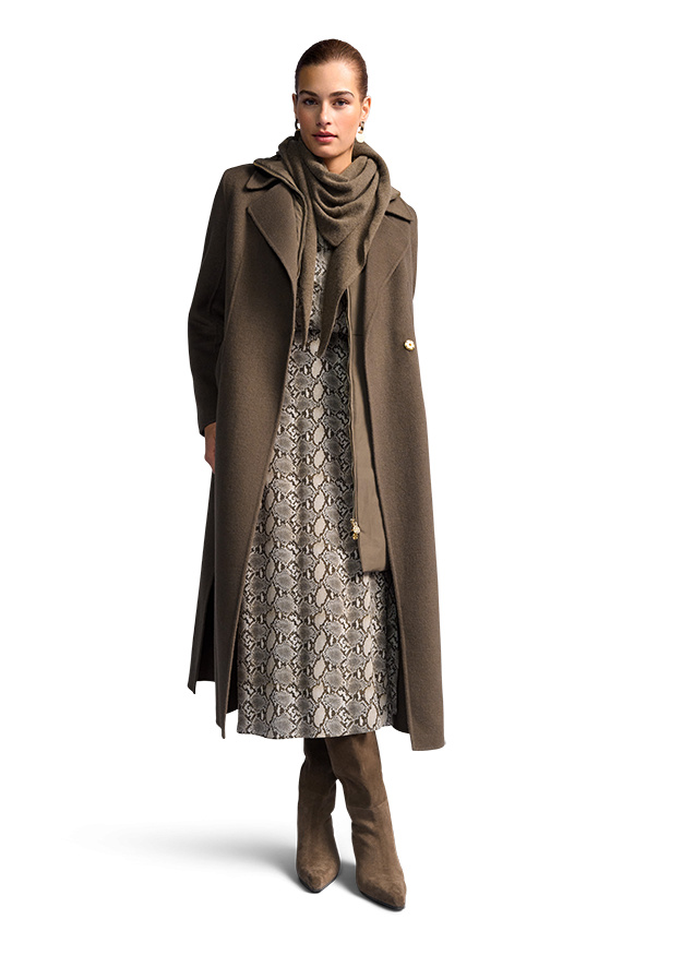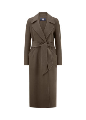 Vācu modes zīmola Riani klasisks sieviešu mētelis tumšā haki tonī. Izgatavots no bieza vilnas un viskozes maisījuma auduma. Papildināts ar slēptu divrindu spiedpogu aizdari un sasienamu jostu.