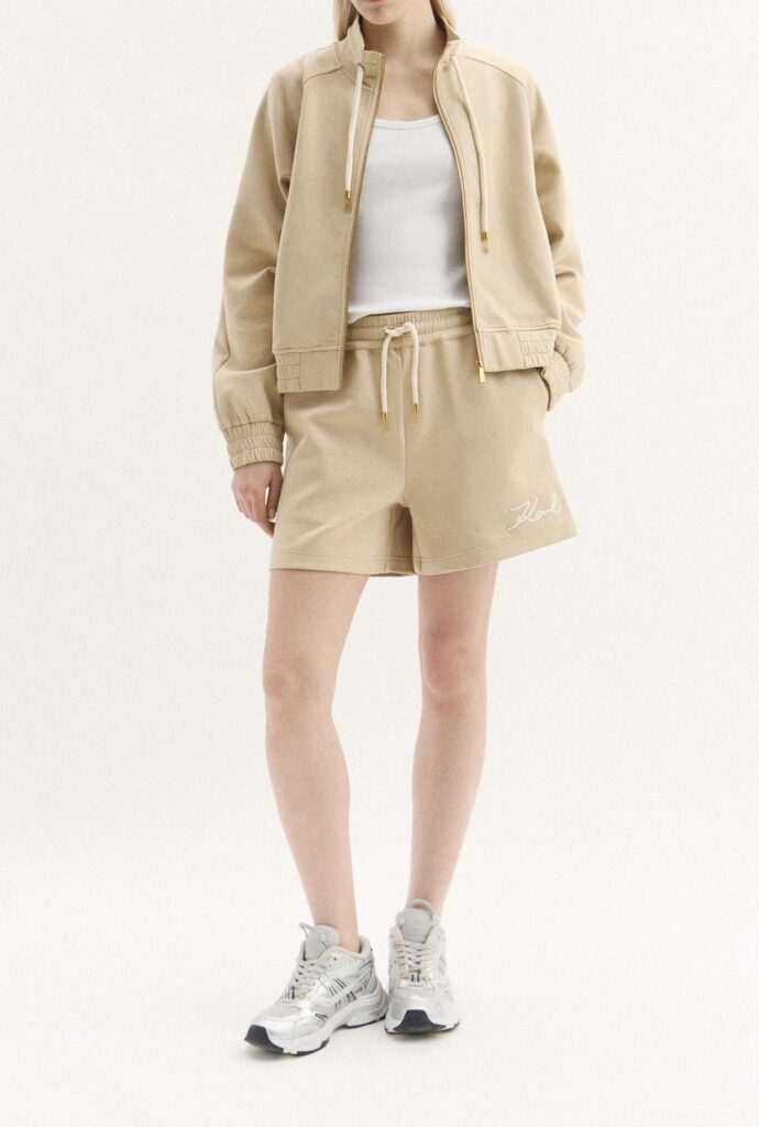 Vācu luksusa zīmola Karl Lagerfeld bēši sieviešu sportiskā stila šorti ar elastīgu sasienamo jostasvietu. Izgatavoti no blīva un elastīga kokvilnas maisījuma materiāla. Akcentēti ar zelta krāsas monogrammu piekariņiem un zīmola paraksta auklas veida izšuvumu.