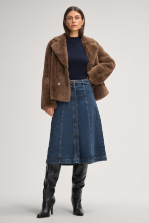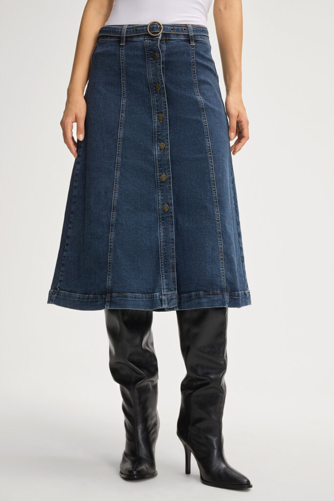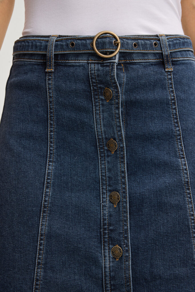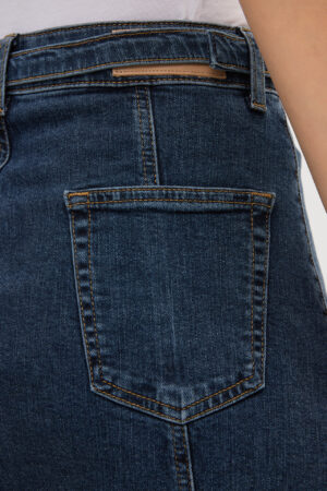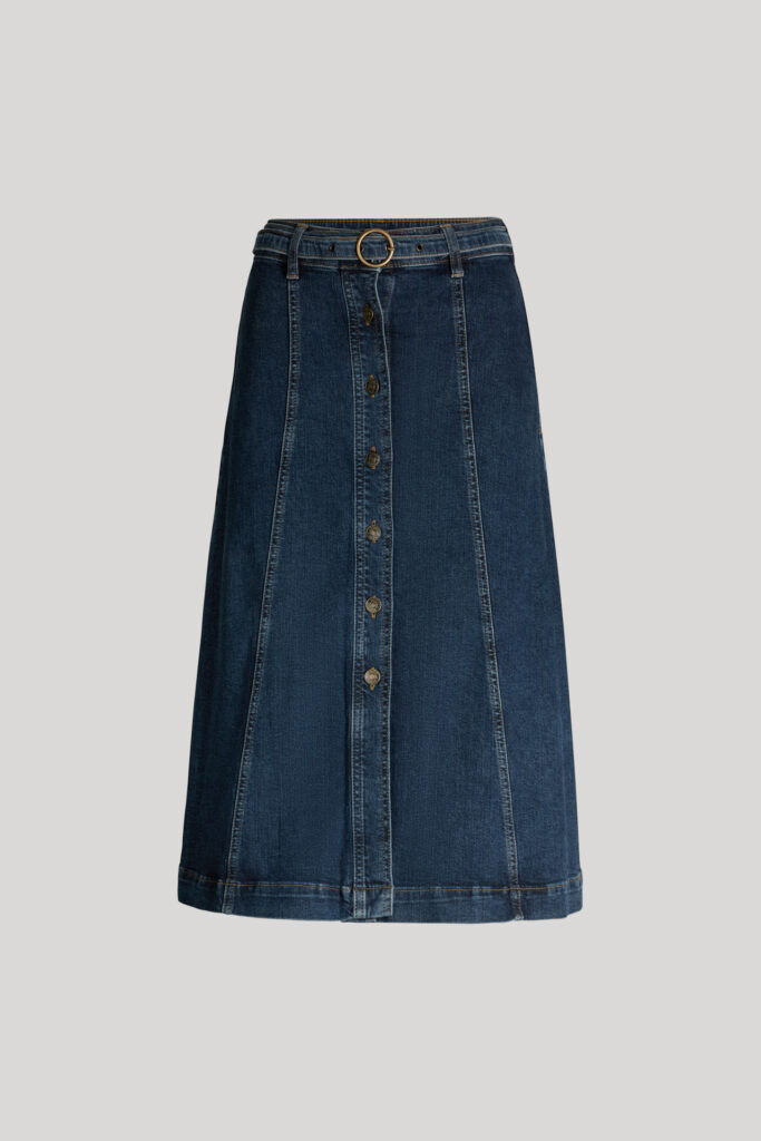 Vācu modes zīmola Joop! tumši zili A silueta džinsu svārki sievietēm. Izgatavoti no viegli elastīgas kokvilnas. Papildināti ar zīmola dizaina pogu aizdari, kontrastējošām nošuvēm un sprādzējamu jostu.