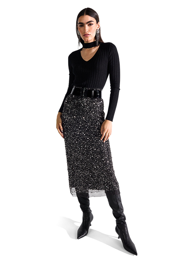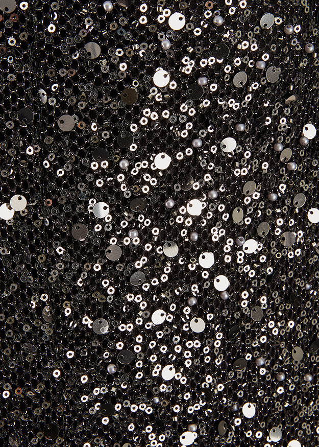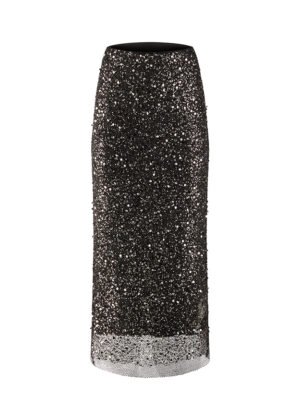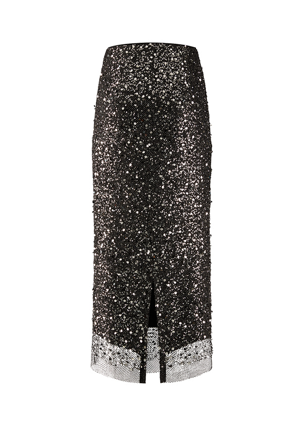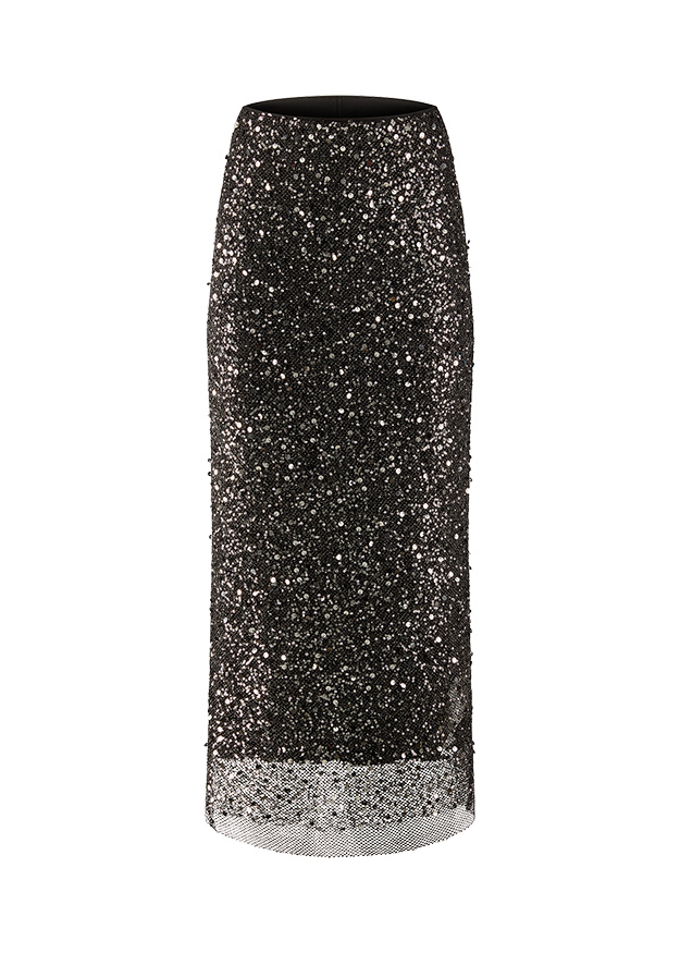 Vācu modes zīmola Riani grezni sieviešu svārki ar elastīgu jostasvietu melnā krāsā. Izgatavoti no tīklveida auduma ar mirdzošu fliteru un smalku pērlīšu izšuvumu. Papildināti ar oderi un smalku tīkliņveida apakšmalu, kā arī šķēlumu mugurpusē.