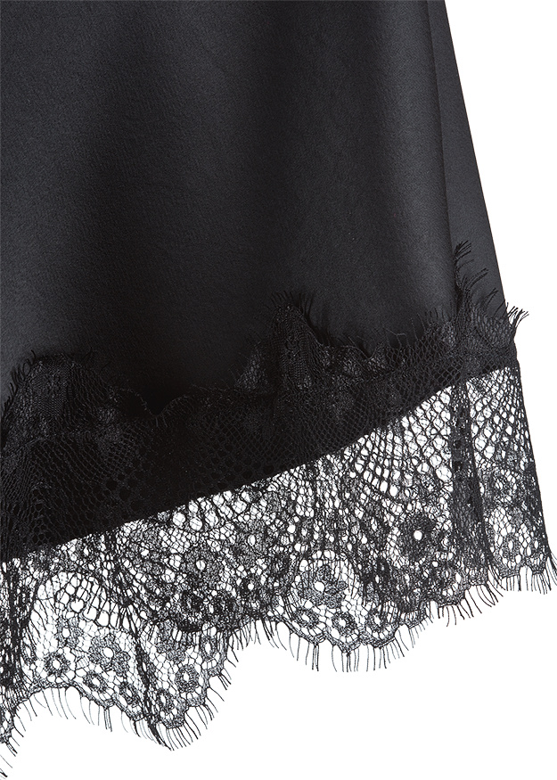 Vācu modes zīmola Riani melni A silueta svārki ar mugurpusē elastīgu jostasvietu. Izgatavoti no plūstoša satīna auduma ar vieglu spīdumu. Akcentēti ar smalku mežģīni apakšmalā.