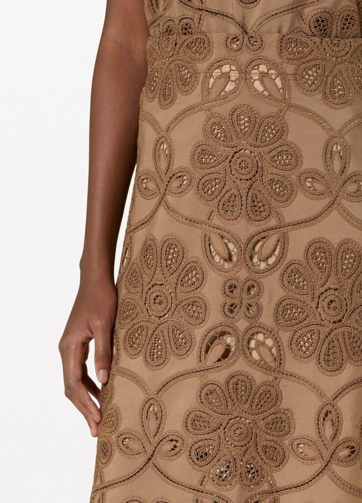 Vācu modes zīmola Riani grezni taisna piegriezuma svārki kanēļa brūnā tonī. Izgatavoti no augstākās kvalitātes materiāla ar smalku izšuvumu rakstu. Papildināti ar dekoratīvu apakšmalas apdari, elastīgu jostasvietu un viskozes apakšsvārkiem.