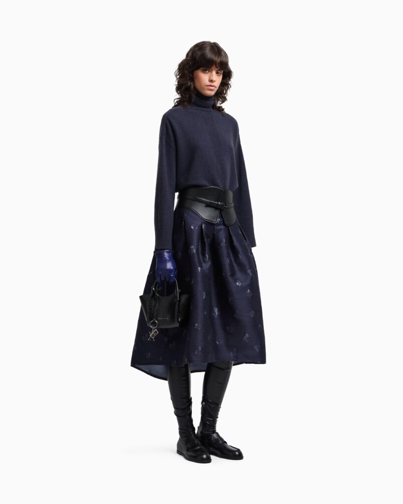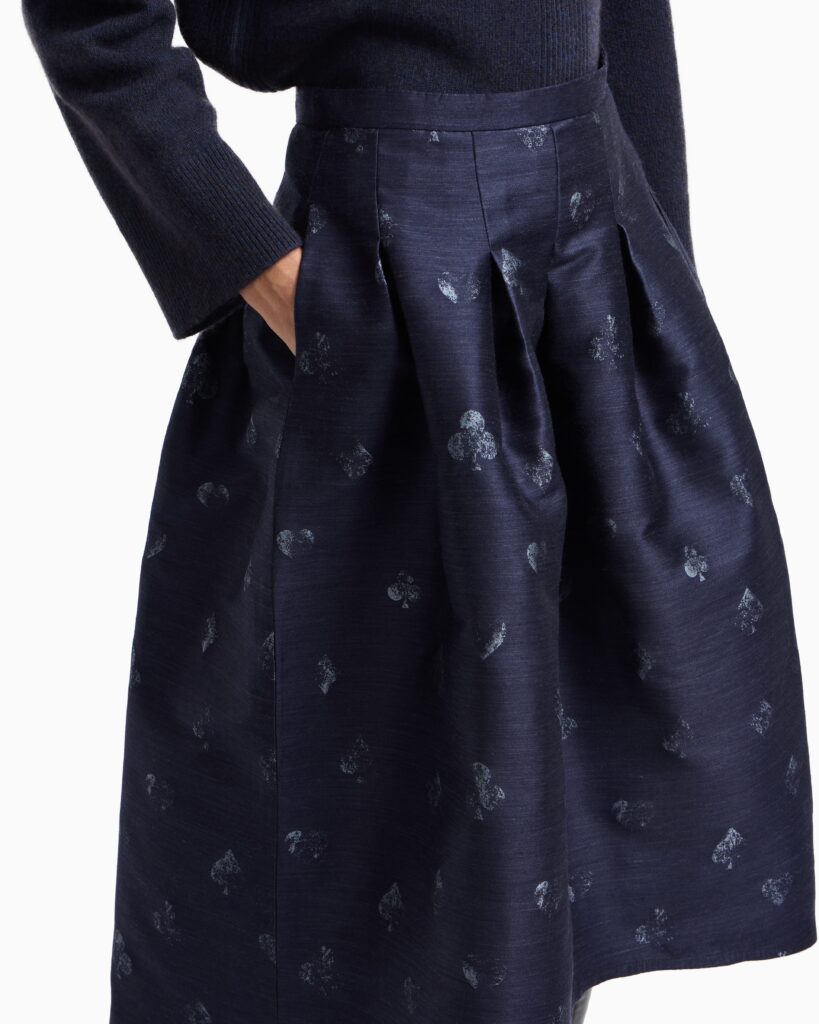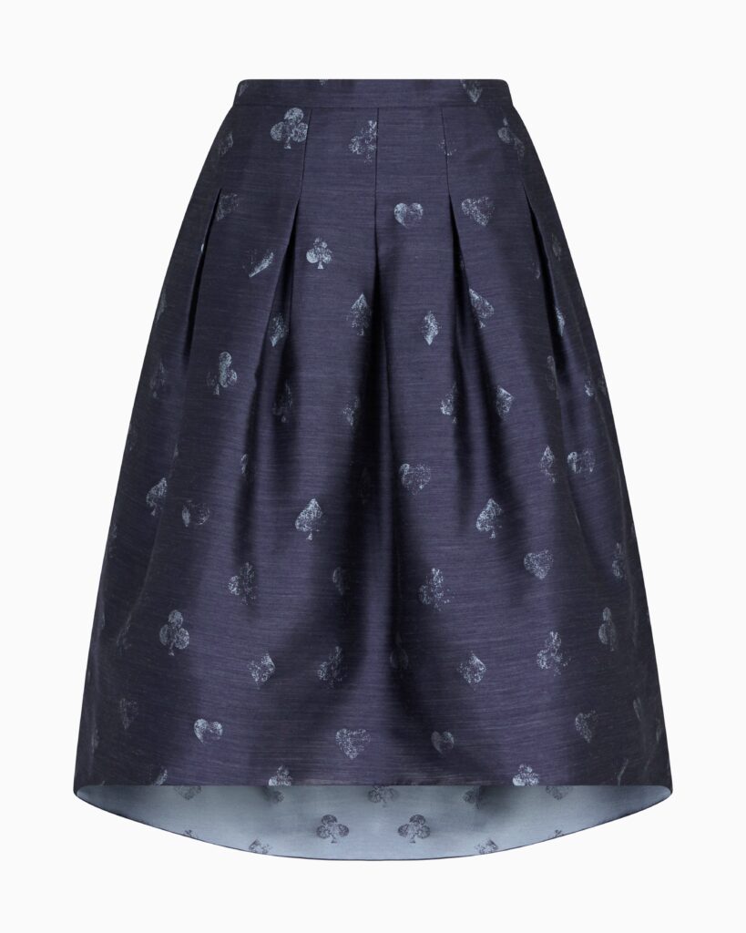 Itāļu luksusa zīmola Emporio Armani tumši zili sieviešu svārki ar izsmalcinātu ombre efekta kāršu simbolu rakstu no Jeu de Cartes kolekcijas. Izgatavoti no smalka vilnas maisījuma žakarda auduma. Akcentēti ar mugurpusē pagarinātu apakšmalu. Papildināti ar nošūtām ielocēm un sānu kabatām.