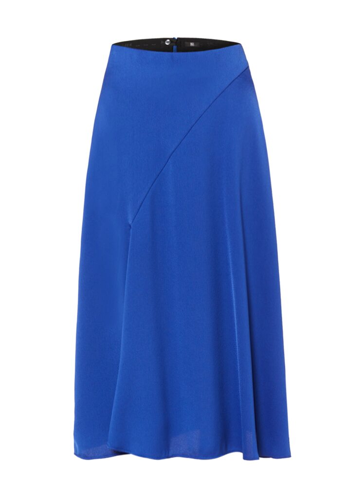 Vācu modes zīmola Riani A silueta midi garuma sieviešu svārki ar asimetrisku šķēlumu koši zilā krāsā.