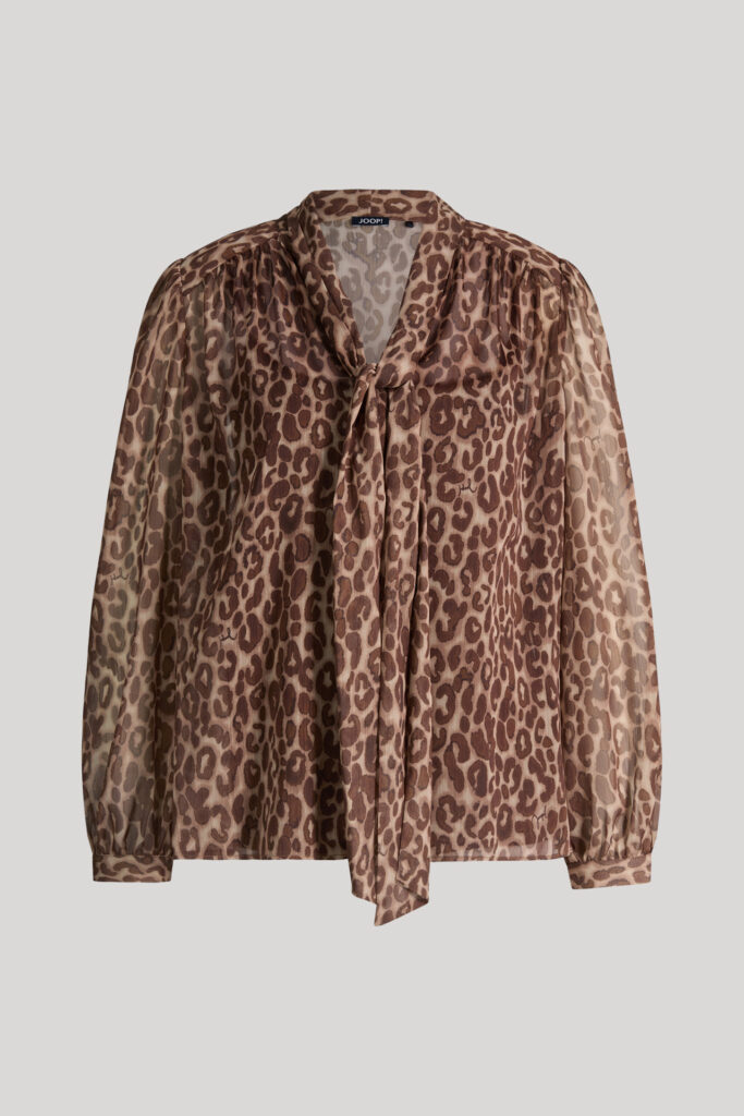 Vācu modes zīmola Joop! brūna sieviešu blūze ar leoparda motīvu rakstu, kas mijas ar smalkiem zīmola logotipa akcentiem. Izgatavota no viegla un gaisīga šifona auduma. Papildināta ar sasienamu apkakles lentu un apakškreklu ar fiksējamām plecu lencēm, kā arī nelieliem sānu šķēlumiem.