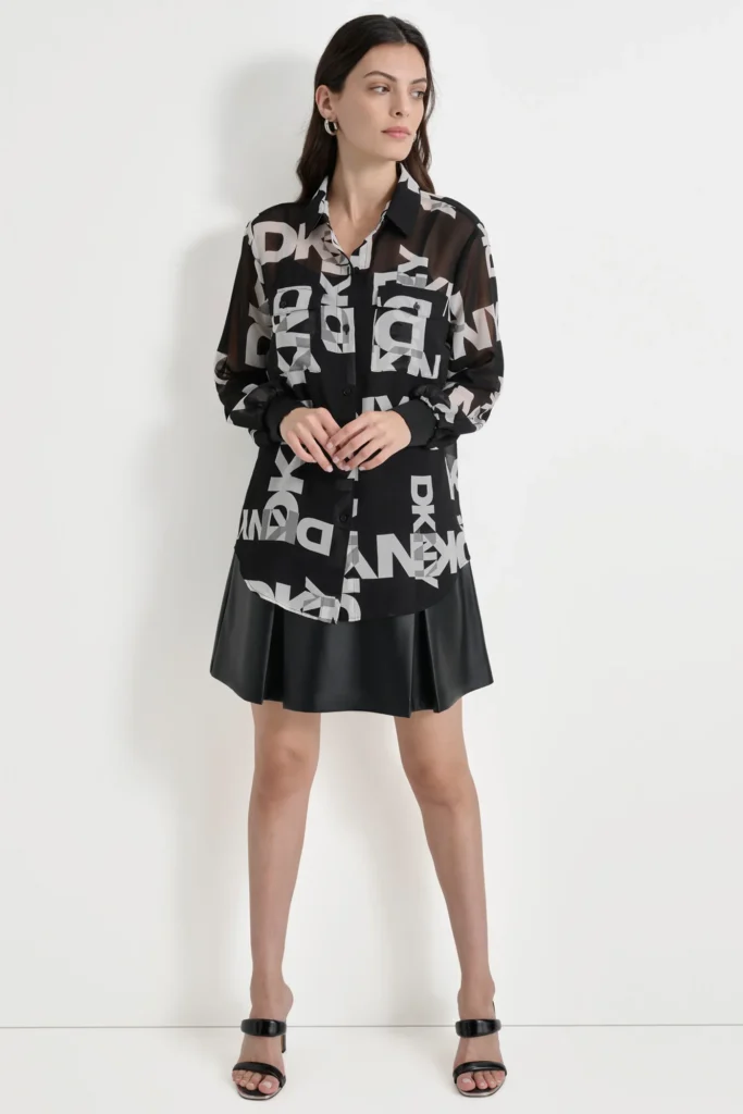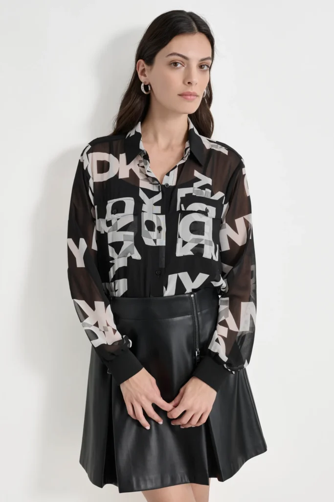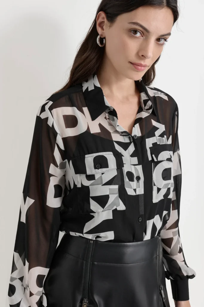 ASV modes zīmola DKNY melna sieviešu kreklveida blūze ar kontrastējošu logo rakstu gaiši pelēkā krāsā. Izgatavota no viegli caurspīdīga un gaisīga auduma. Papildināta ar elastīgām aprocēm, uzšūtām krūšu kabatāma, kā arī atsevišķu apakškreklu ar regulējamām plecu lencītēm.