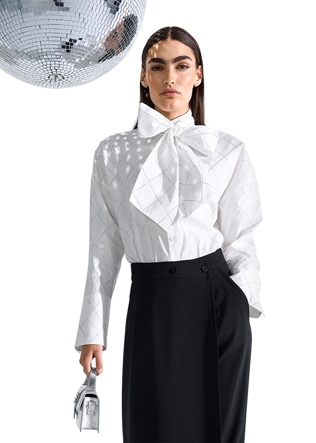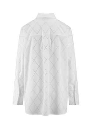 Vācu modes zīmola Riani balta sieviešu kreklveida blūze ar mirdzošu akmentiņu rakstu. Izgatavota no elastīga kokvilnas poplīna. Papildināta ar fiksētu, sasienamu apkakles lenti, platām aprocēm un noapaļotiem sānu šķēlumiem.
