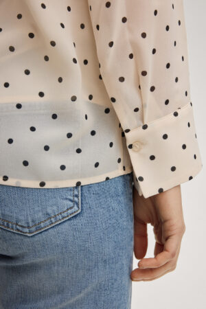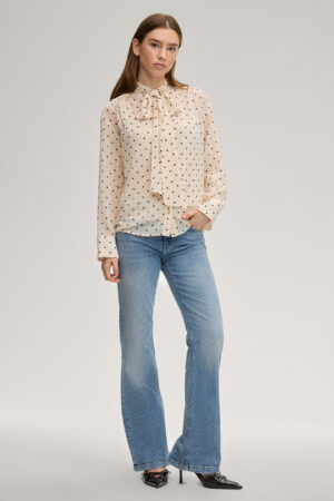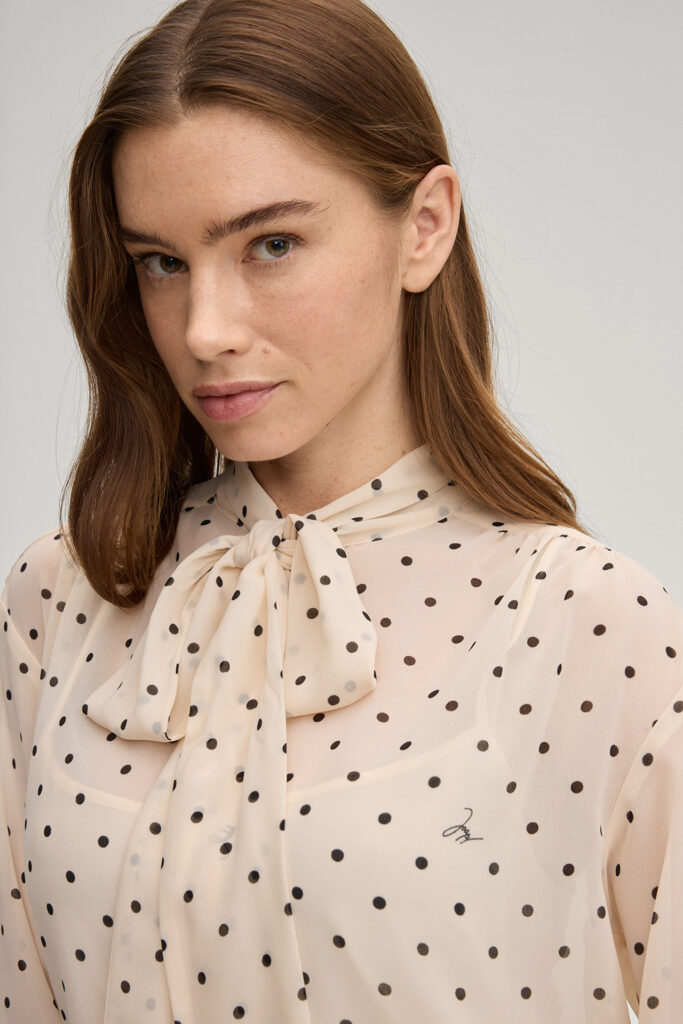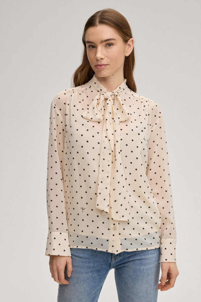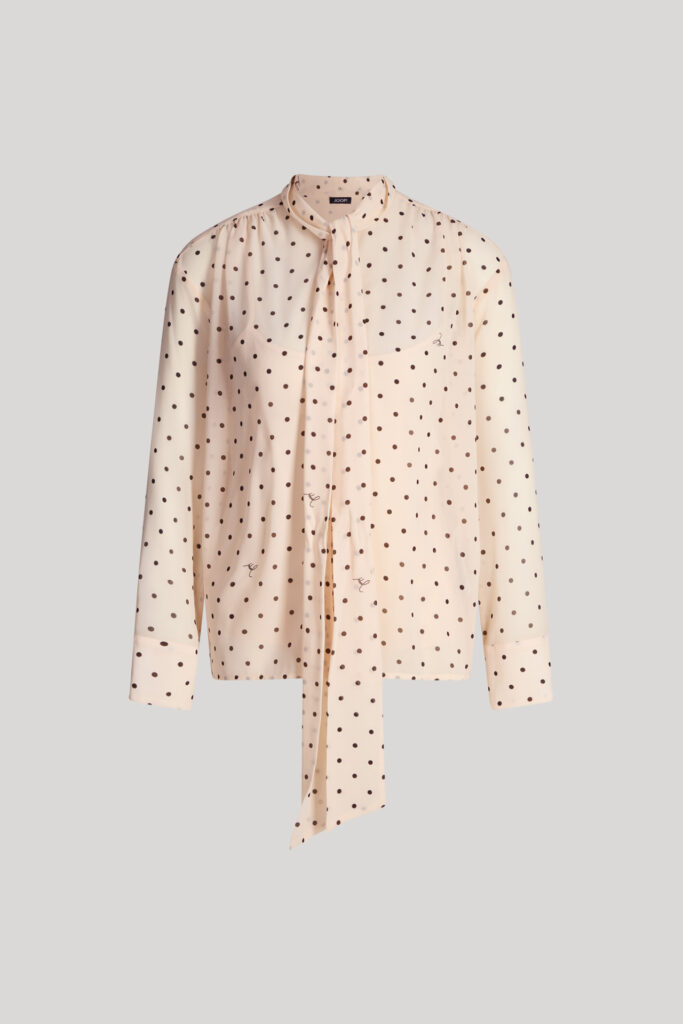 Vācu modes zīmola Joop! krēmīgi bēša sieviešu blūze ar melnu punkveida rakstu, kas mijas ar smalkiem zīmola logotipa akcentiem. Izgatavota no viegla un gaisīga šifona auduma. Papildināta ar sasienamu apkakles lentu un apakškreklu ar fiksējamām plecu lencēm.