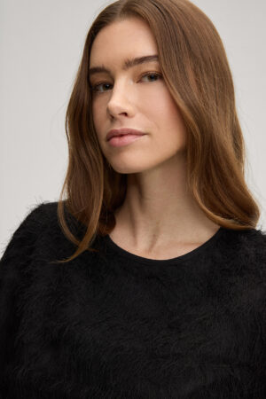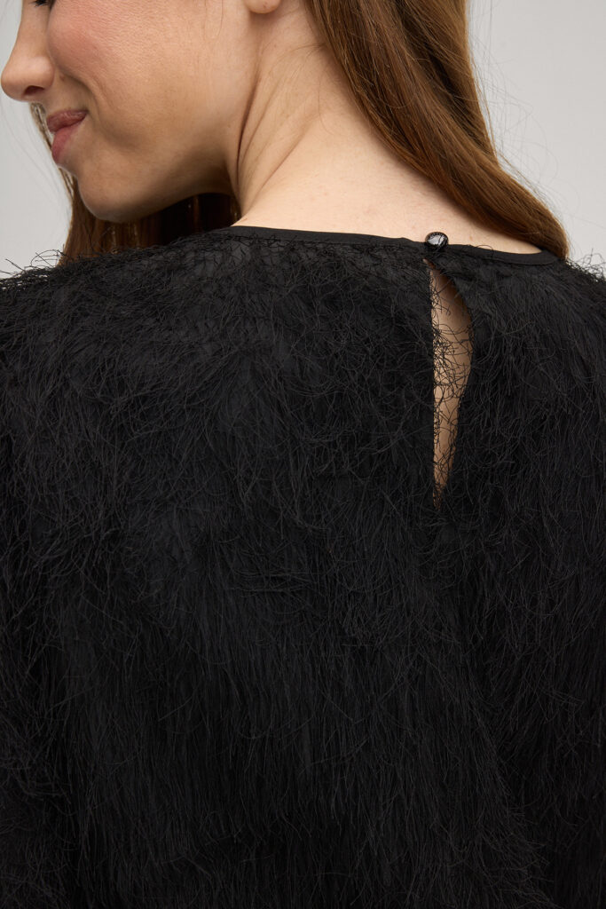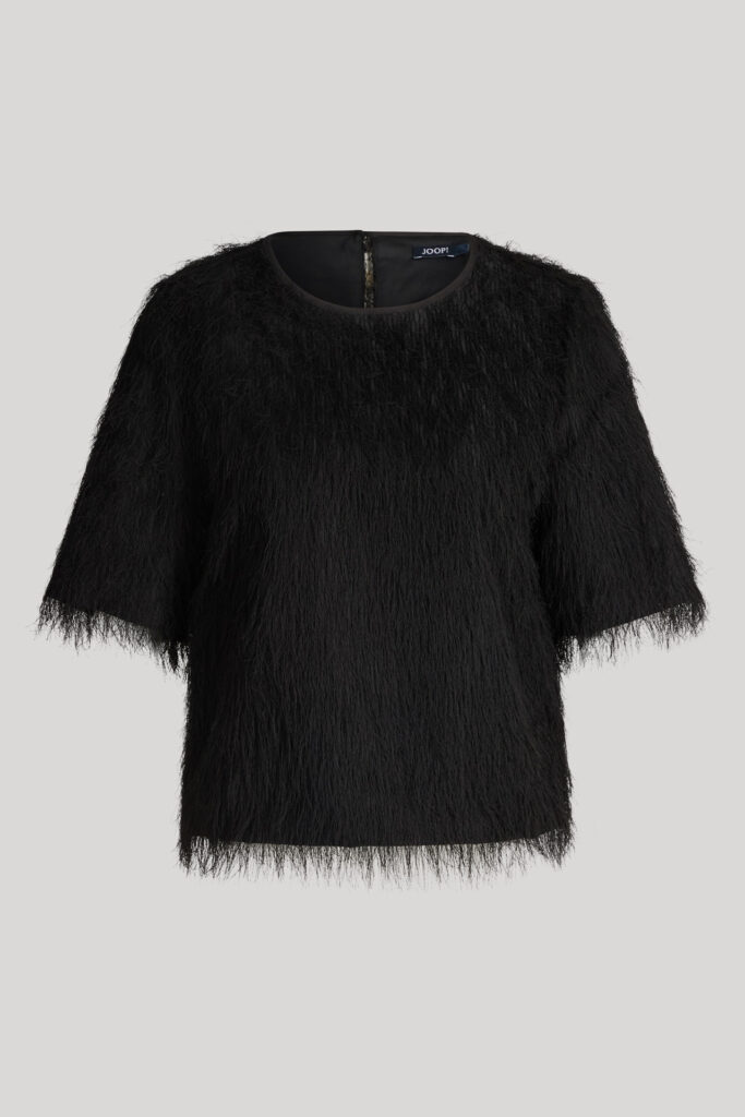 Vācu modes zīmola Joop! melna sieviešu blūze ar pusgarām piedurknēm. Izgatavota no viegla materiāla ar smalku bārkstiņu pārklājumu. Papildināta ar plānu oderi un pogas aizdari mugurpusē.