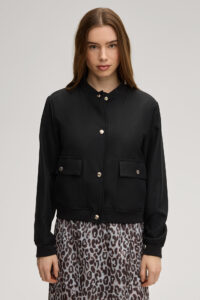 Vācu modes zīmola Joop! melna sieviešu blūze ar pusgarām piedurknēm. Izgatavota no viegla materiāla ar smalku bārkstiņu pārklājumu. Papildināta ar plānu oderi un pogas aizdari mugurpusē.
