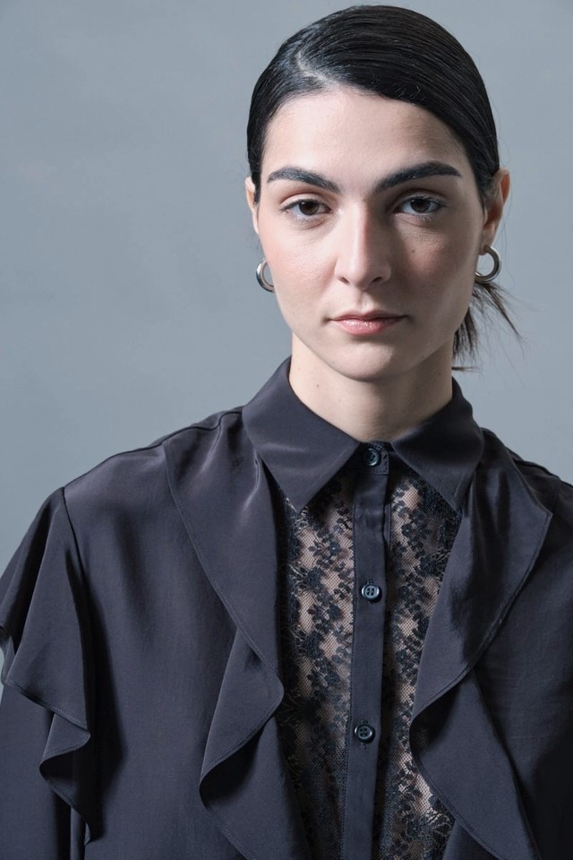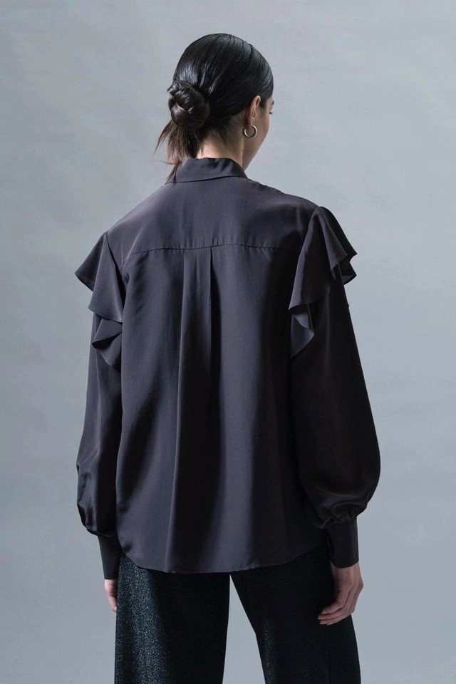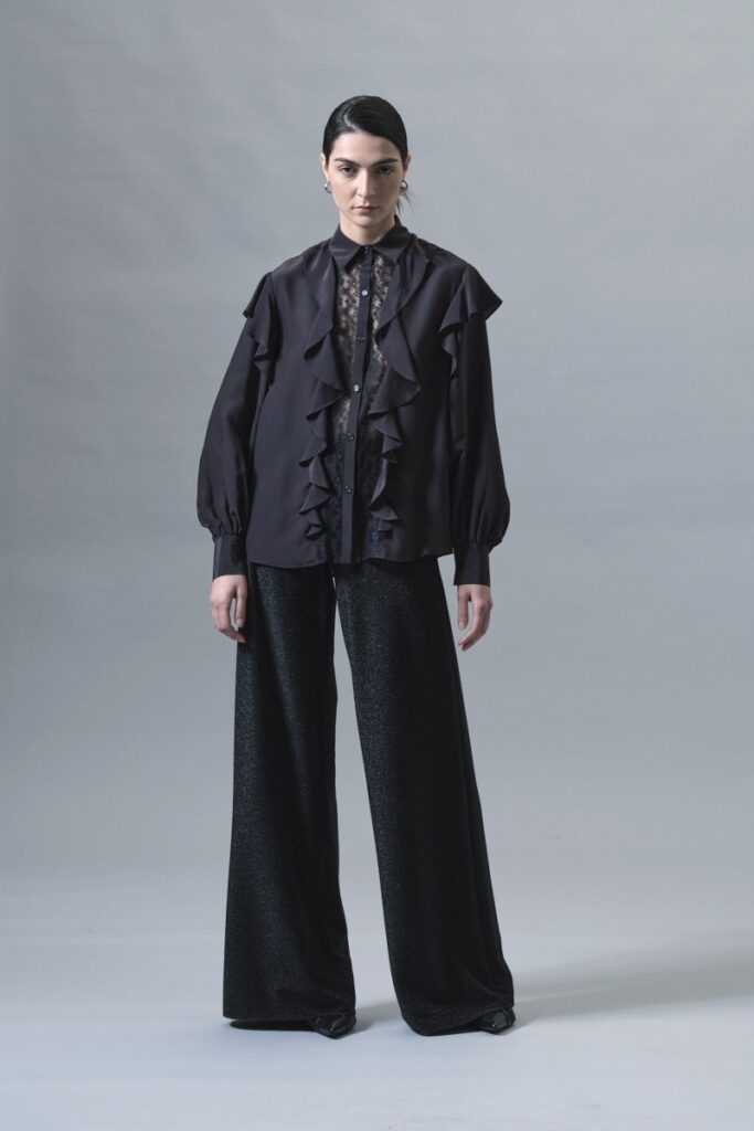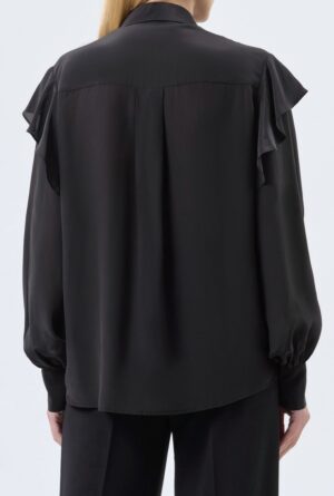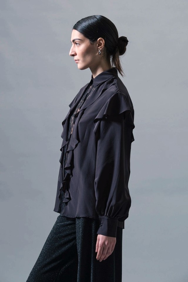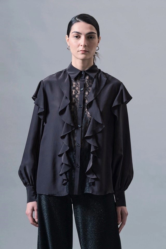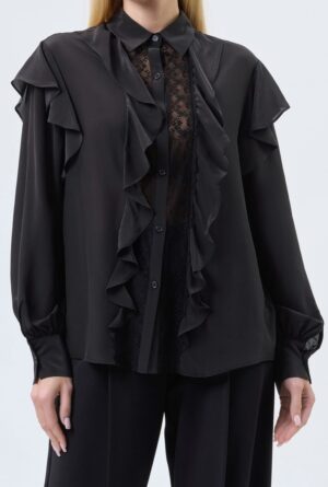 Itāļu modes zīmola KAOS melna sieviešu blūze ar vertikālu volānu apdari un smalku mežģīņu ielaidumu priekšpusē. Izgatavota no viegla viskozes un zīda maisījuma materiāla. Papildināta ar ielocēm mugurpusē un noapaļotu apakšmalu.