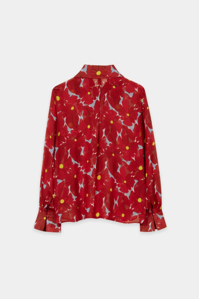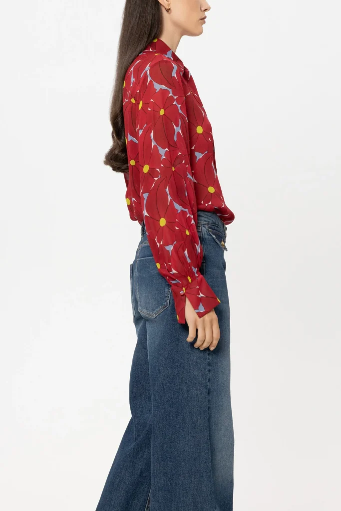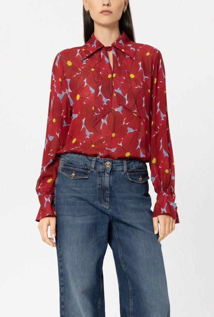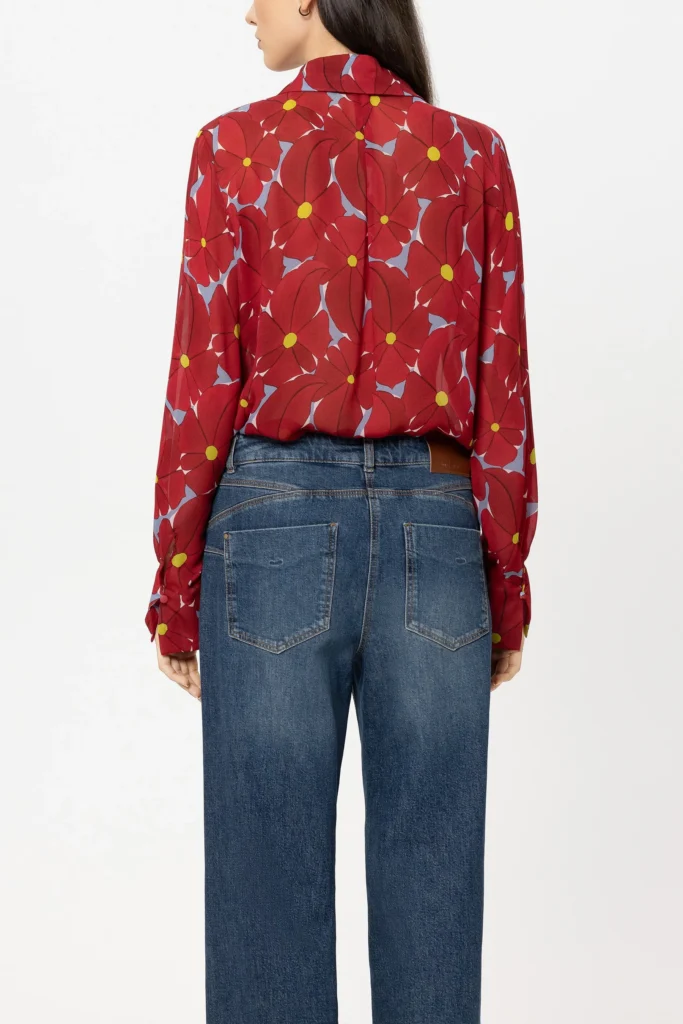 Vācu premium klases apģērbu zīmola Luisa Cerano gaisīga sieviešu blūze ar ekskluzīvu ziedu apdruku ķiršu sarkanā krāsā, Izgatavota no viegla un daļēji caurspīdīga viskozes auduma. Papildināta ar ieveramu apkakles lenti, elegantām aprocēm un ieloci mugurpusē.