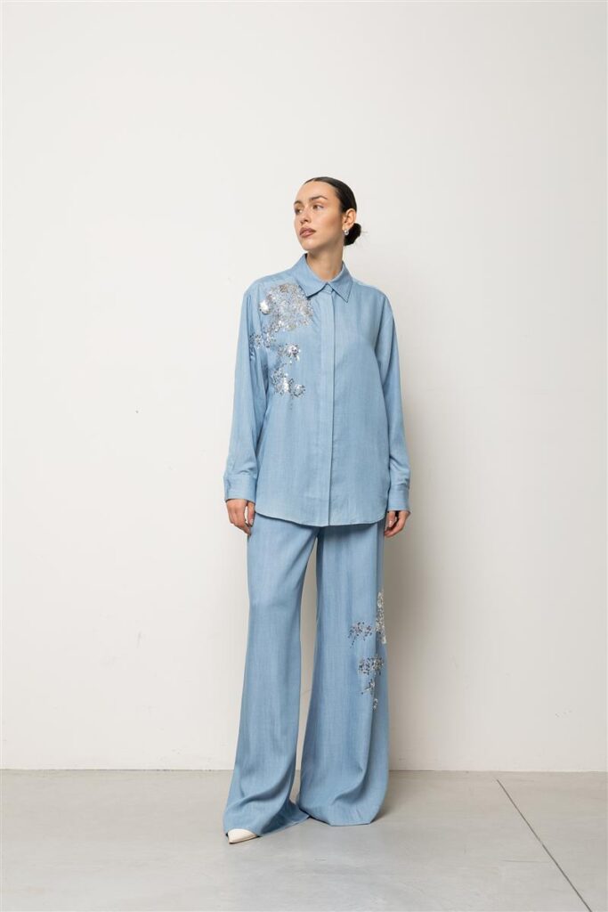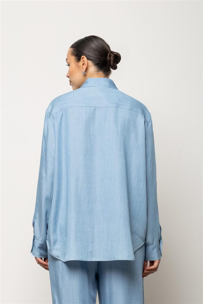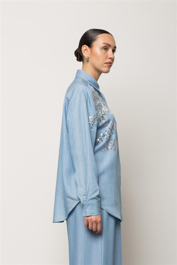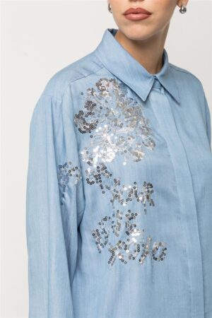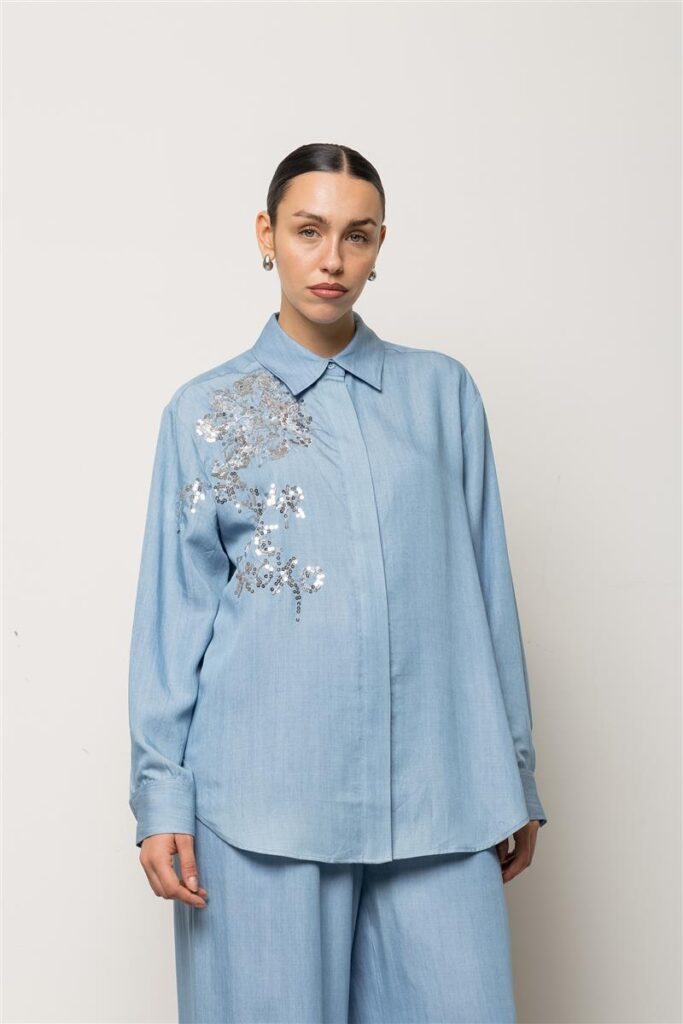 Itāļu modes zīmola KAOS brīva piegriezuma sieviešu krekls gaiši džinsu zilā krāsā. Izgatavots no viegla un plūstoša TENCEL materiāla. Papildināts ar slēptu pogu aizdari un noapaļotu apakšmalu. Akcentēts ar mirdzošu sudraba krāsas fliteru izšuvumiem.