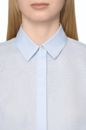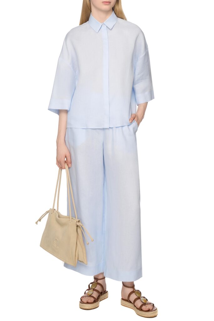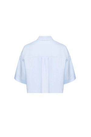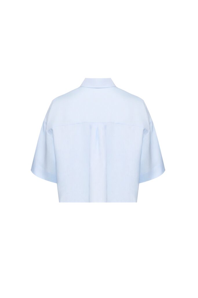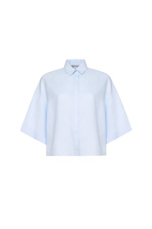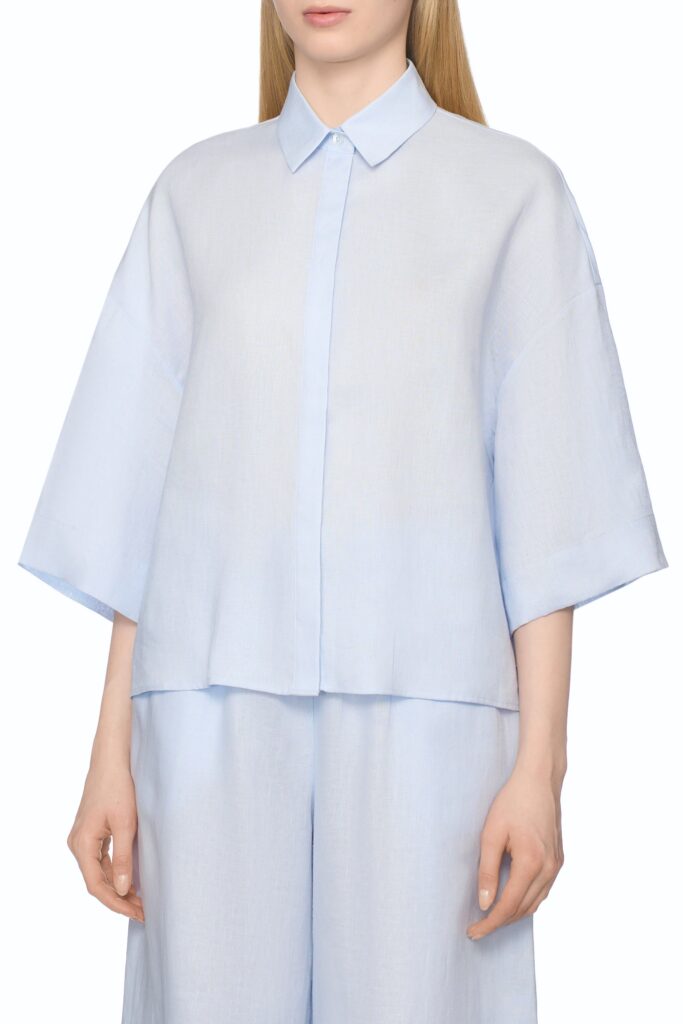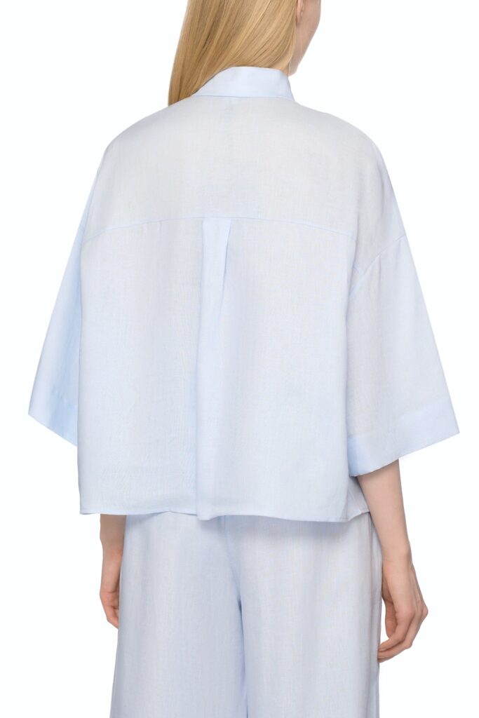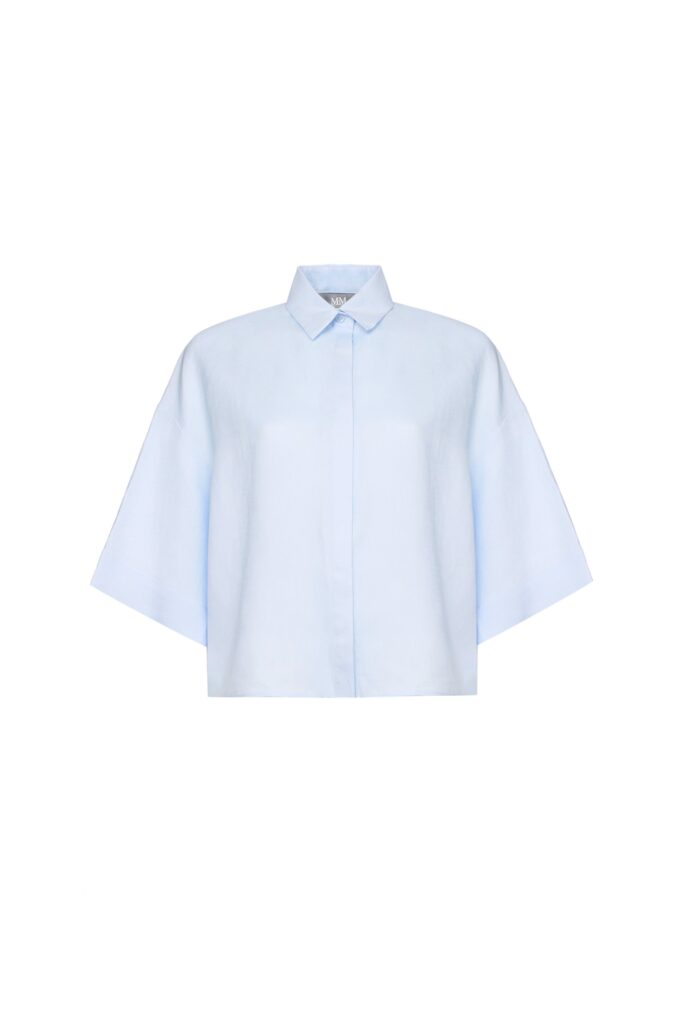 Itāļu modes zīmola MM by Max Mara gaiši zila plata, saīsināta piegriezuma kreklveida blūze sievietēm. Izgatavota no viegla linu auduma. Papildināta ar slēptu pogu aizdari, pusgarām piedurknēm un ielocēm mugurpusē.