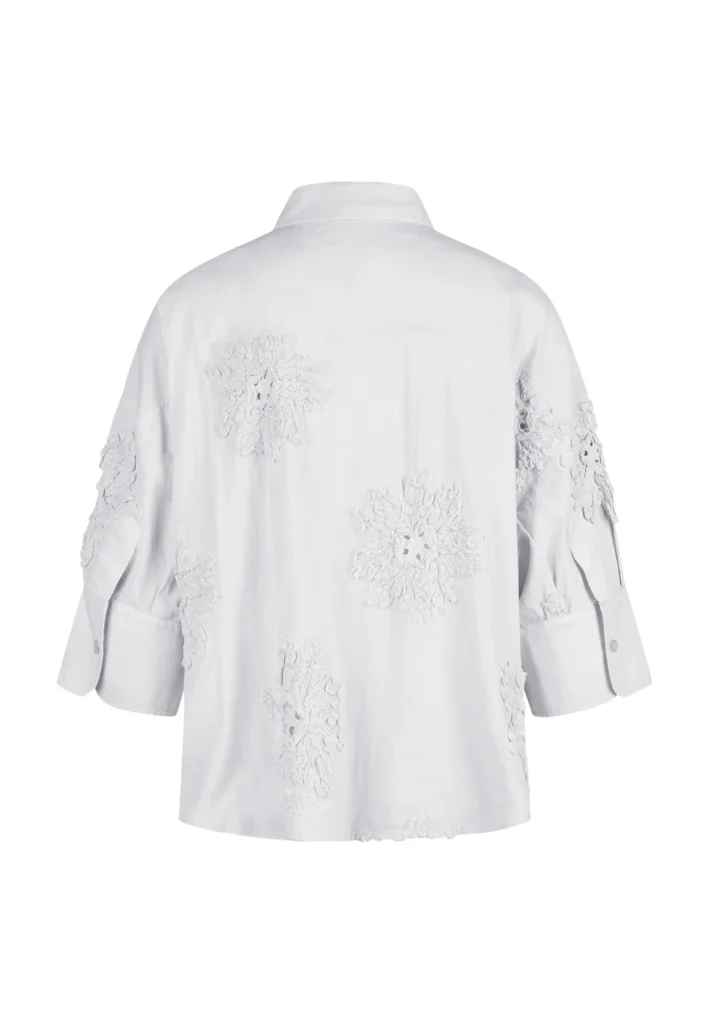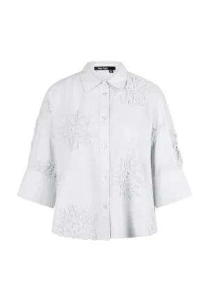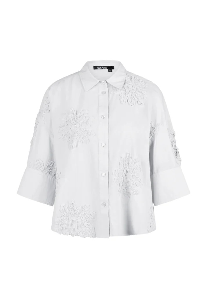 Vācu modes zīmola Marc Aurel balta sieviešu kreklveida blūze ar apjomīgas struktūras ziedu izšuvumiem. Izgatavota no viegla kokvilnas poplīna. Papildināta ar pusgarām piedurknēm un noapaļotu apakšmalu.