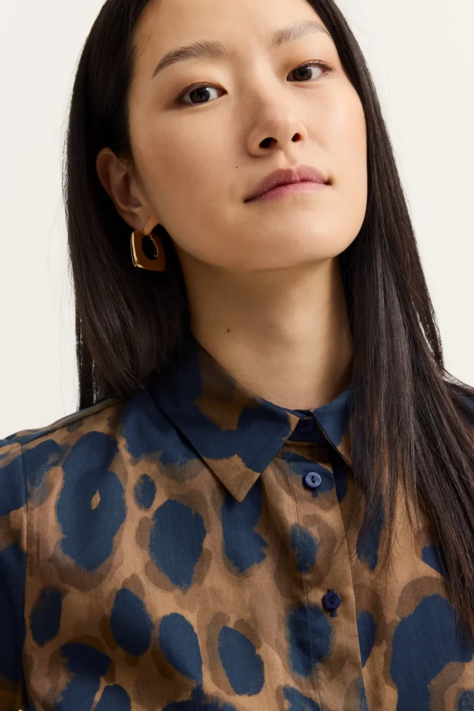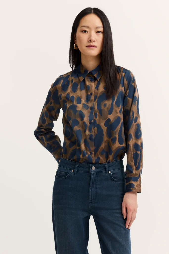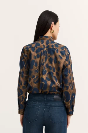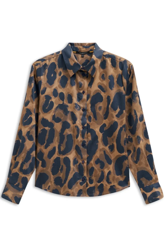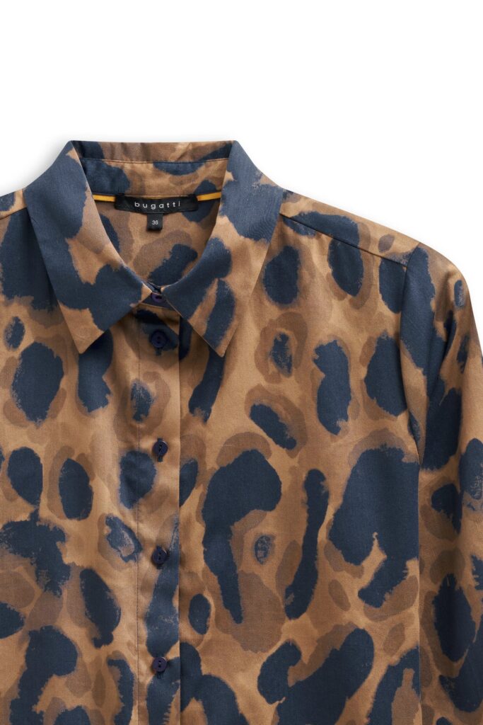 Vācu modes zīmola Bugatti sieviešu kreklveida blūze ar stilizētu leoparda rakstu brūnā un tumši zilā krāsā. Izgatavota no 100% kokvilnas ar satīna struktūru. Papildināta ar smalku zīmola logotipa akcentu noapaļotajā apakšmalā.