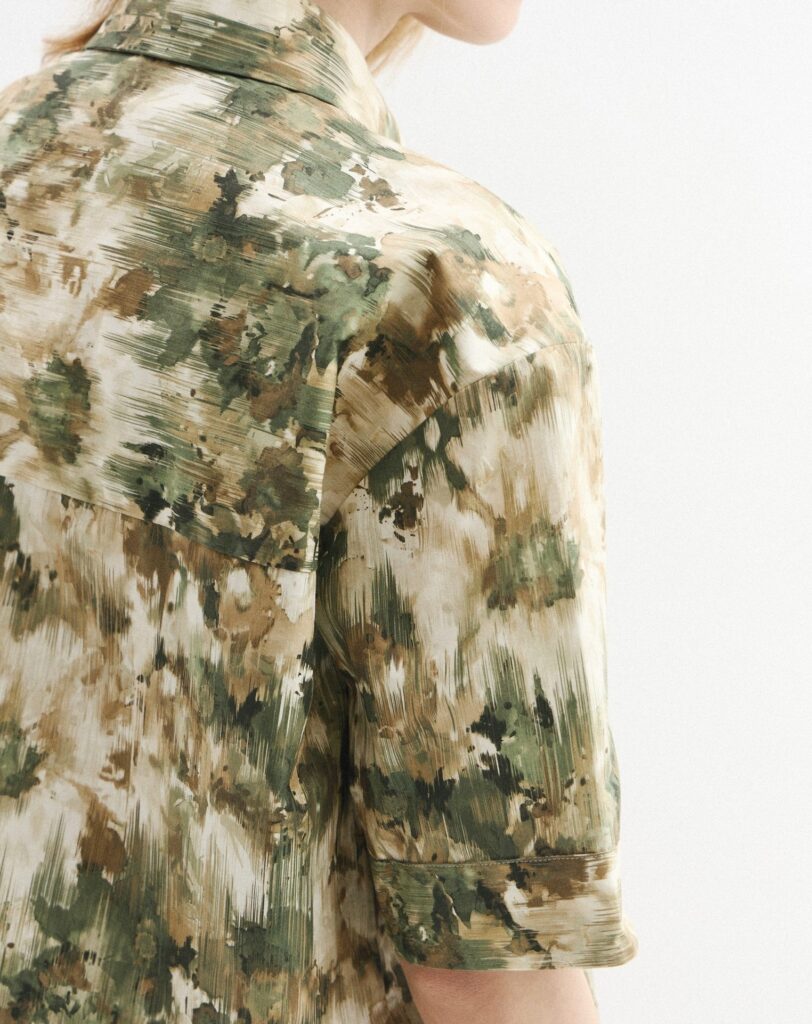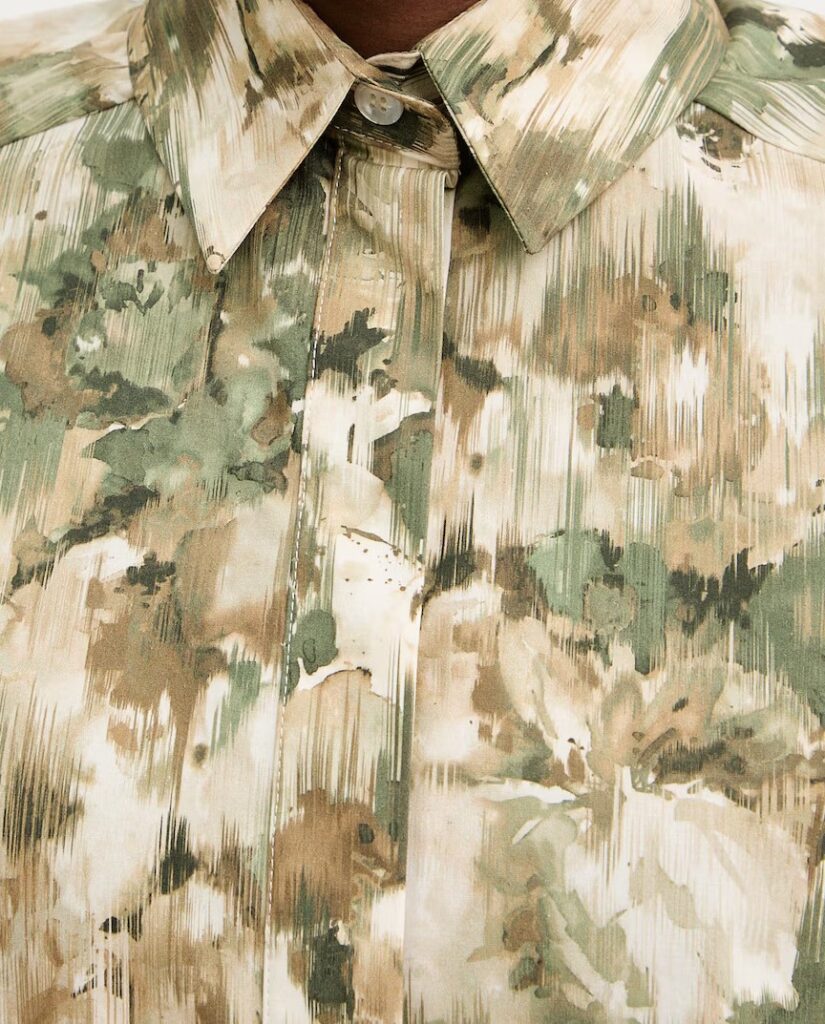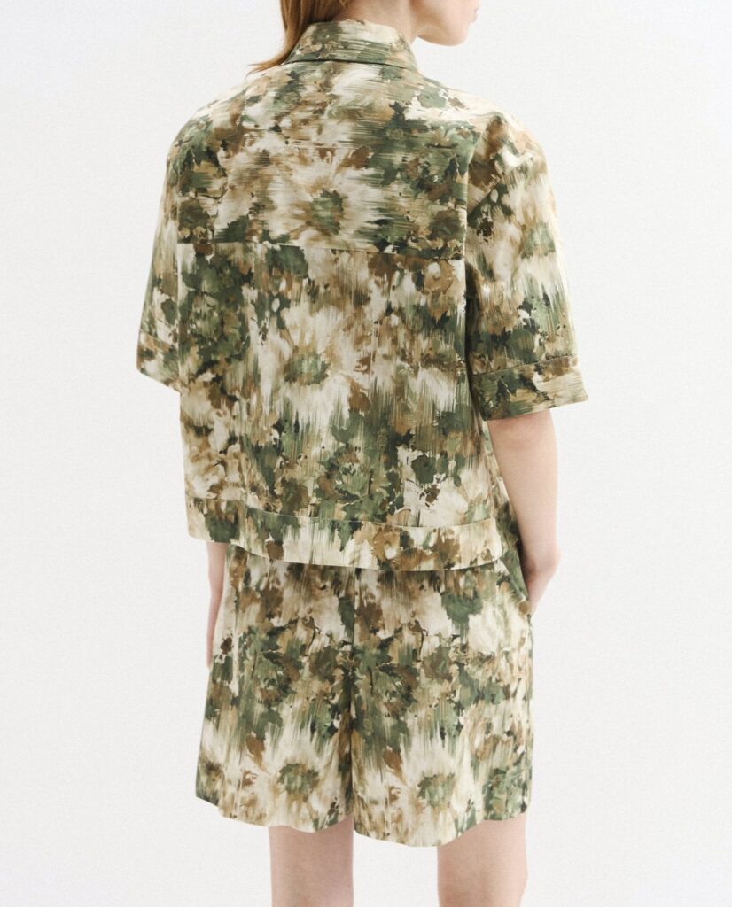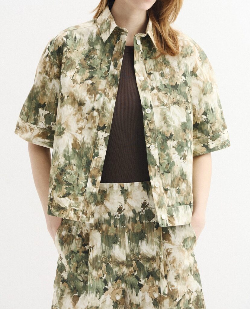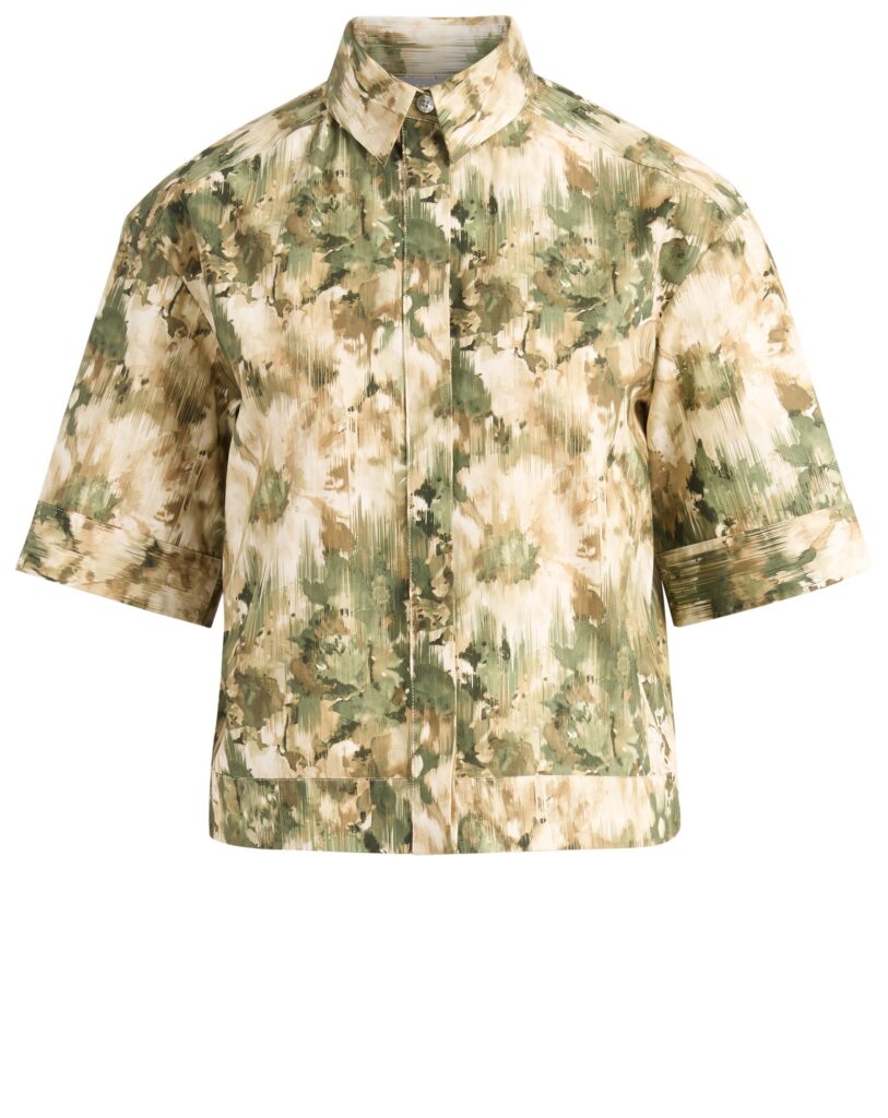 Itāļu modes zīmola MM by Max Mara sieviešu krekls ar abstraktu apdruku bēšos un zaļos toņos. Izgatavots no stingra kokvilnas poplīna materiāla. Papildināts ar slēptu pogu aizdari un īsām piedurknēm.