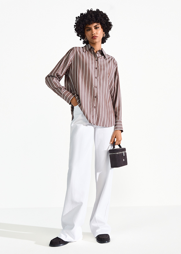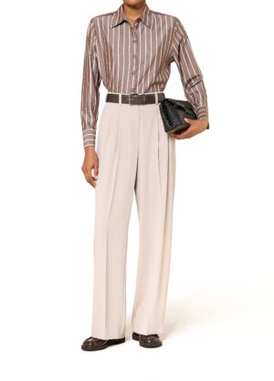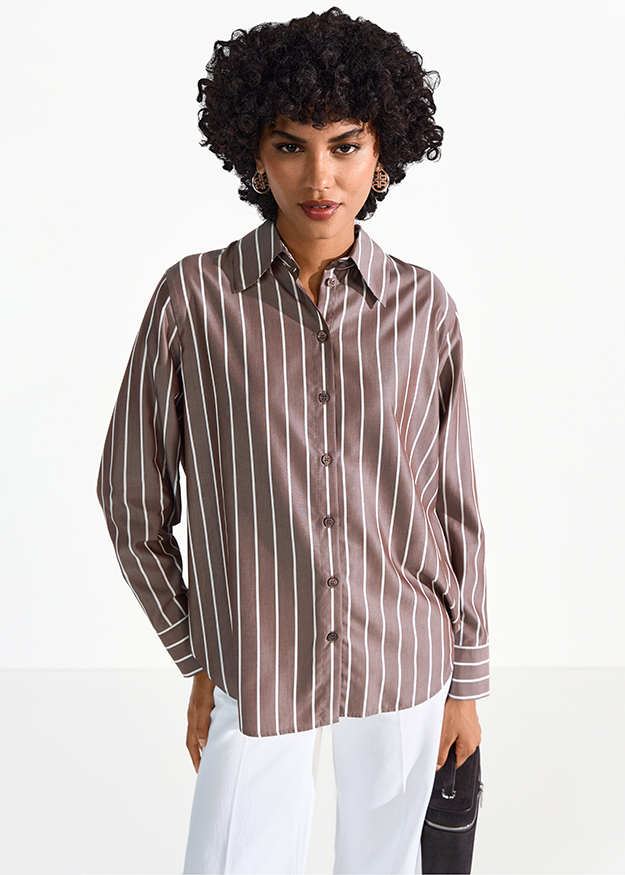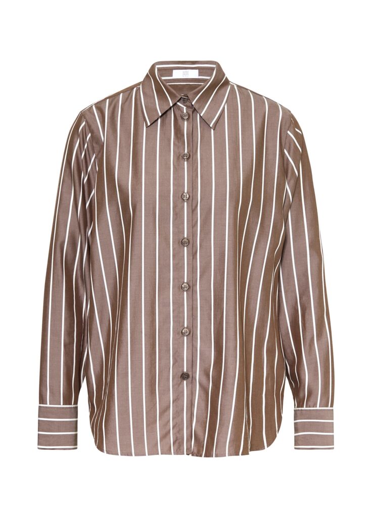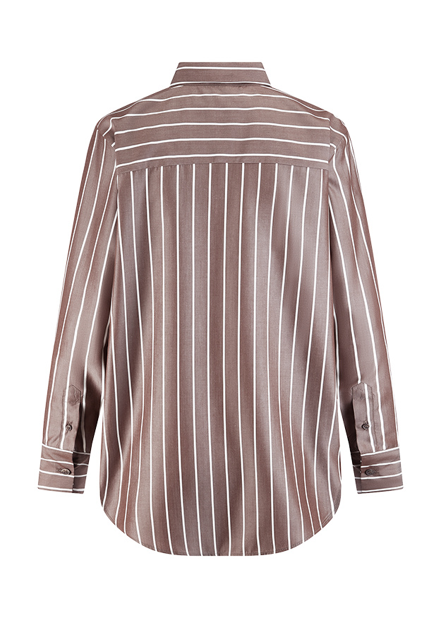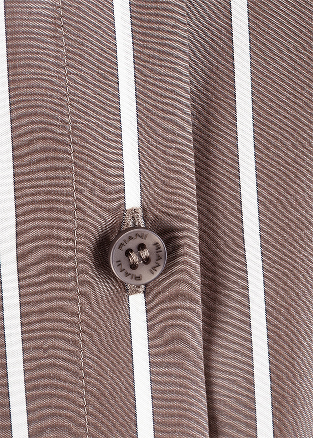 Vācu modes zīmola Riani kanēļbrūna sieviešu kreklveida blūze ar vertikālu svītru rakstu. Izgatavota no augstākās kvalitātes liocela materiāla ar zīdainu struktūru. Papildināta ar pagarinātu, noapaļotu apakšmalu un smalkām zīmola logotipa detaļām.
