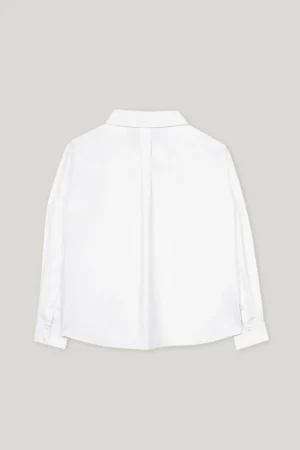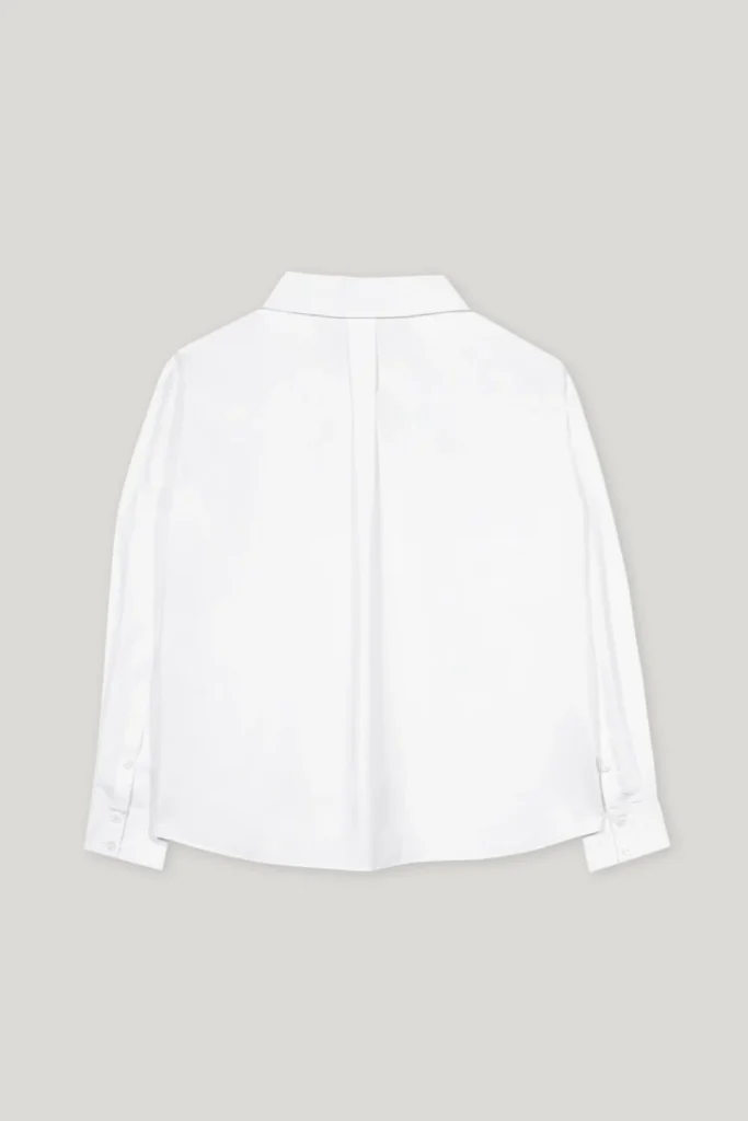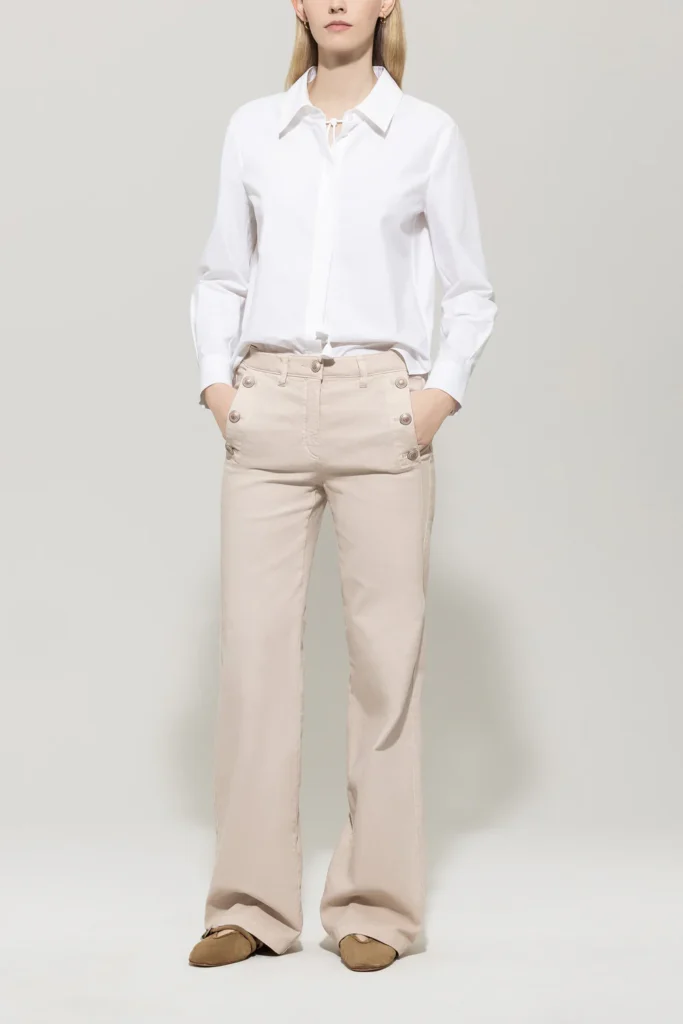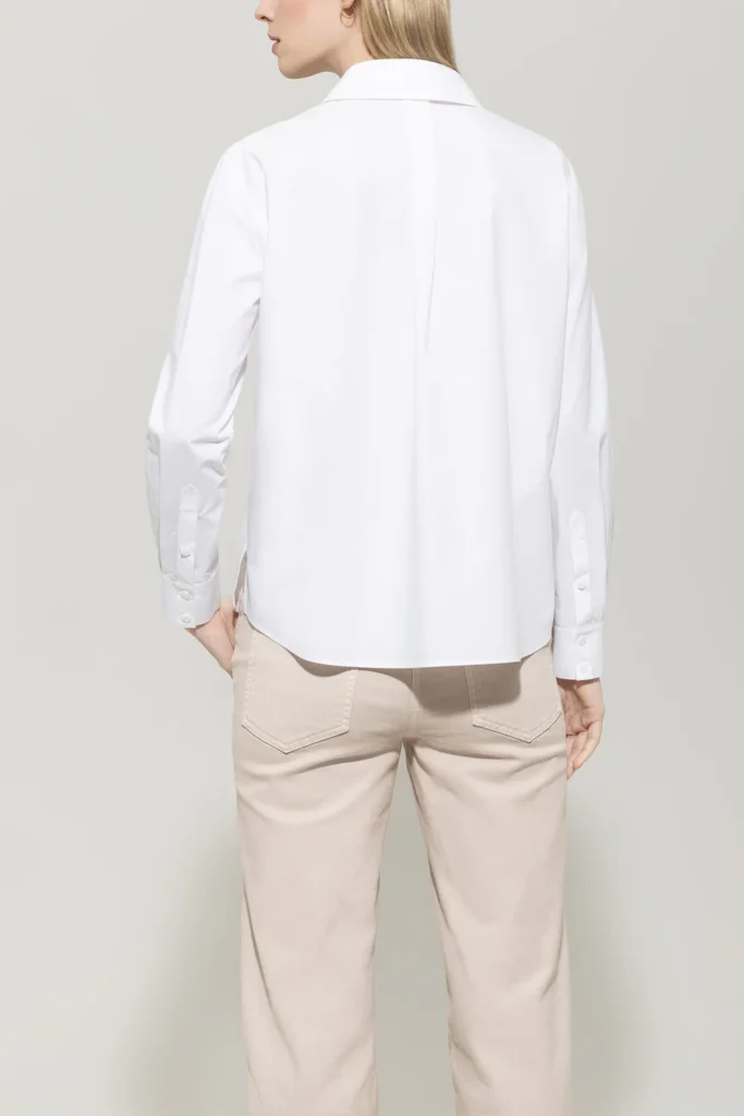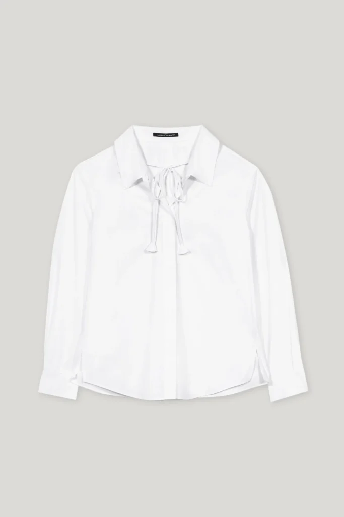 Vācu premium klases apģērbu zīmola Luisa Cerano balta sieviešu kreklveida blūze ar slēptu pogu aizdari. Izgatavota no 100% kokvilnas. Papildināta ar dekoratīvu sasienamo apkakles auklu un sānu šķēlumiem.