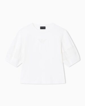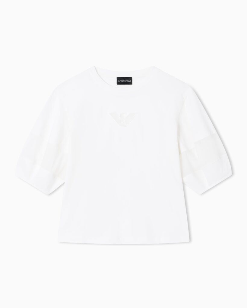 Itāļu luksusa zīmola Emporio Armani krēmbalts brīva piegriezuma sieviešu tops ar pusgarām piedurknēm. Izgatavots no mīksta augstākās kvalitātes kokvilnas materiāla ar smalka sietiņauduma ielaidumiem piedurknēs un ērgļa izšuvumā. Papildināts ar nelieliem sānu šķēlumiem un zīmola logotipu pie apkakles mugurpusē.