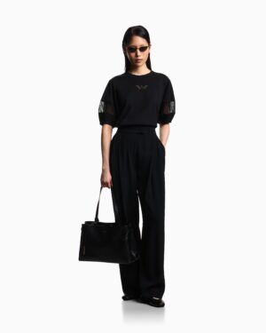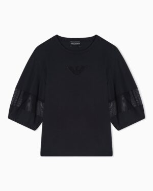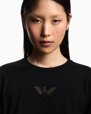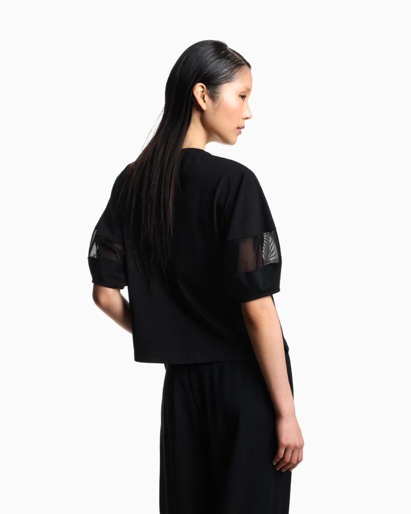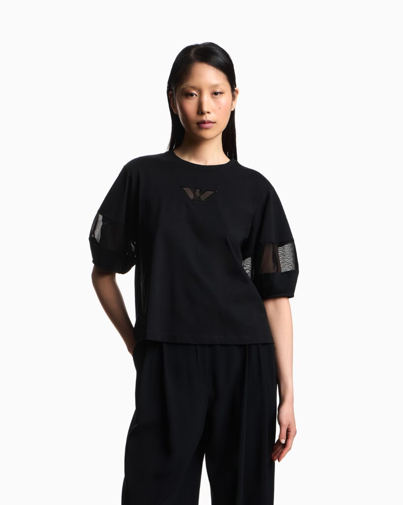 Itāļu luksusa zīmola Emporio Armani melns brīva piegriezuma sieviešu tops ar pusgarām piedurknēm. Izgatavots no mīksta augstākās kvalitātes kokvilnas materiāla ar smalka sietiņauduma ielaidumiem piedurknēs un ērgļa izšuvumā. Papildināts ar nelieliem sānu šķēlumiem un zīmola logotipu pie apkakles mugurpusē.