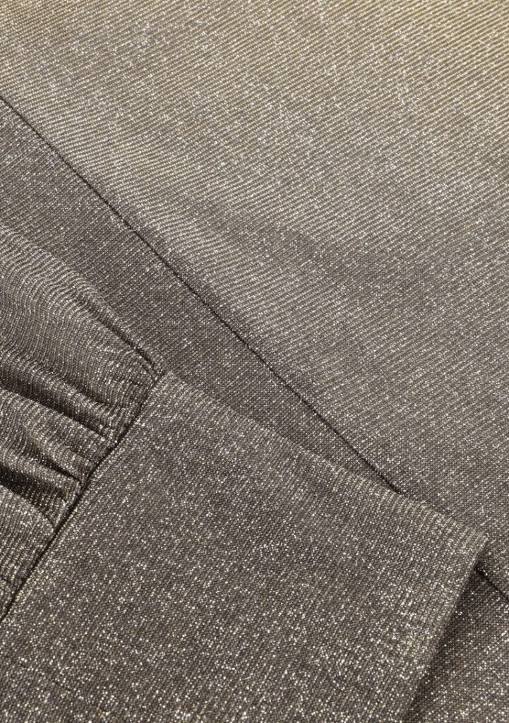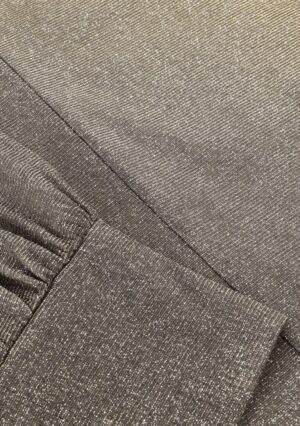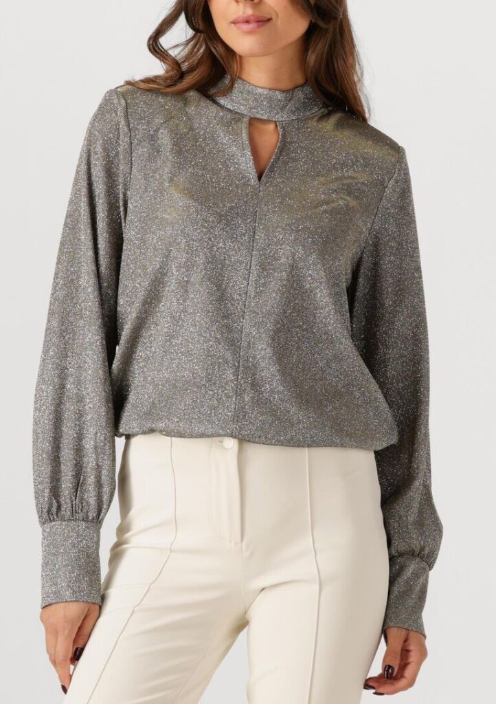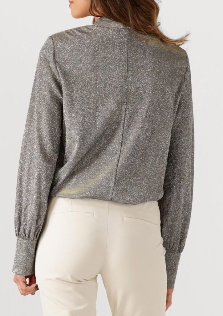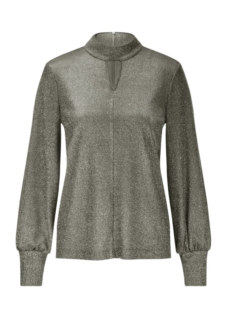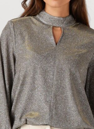 Vācu modes zīmola Riani mirdzoša sieviešu blūze ar garām piedurknēm. Izgatavota no plūstoša poliestera auduma ar metāliskām škiedrām zeltainos un sudrabainos toņos. Papildināta ar dekoratīvu šķēlumu pie paaugstinātās apkakles.
