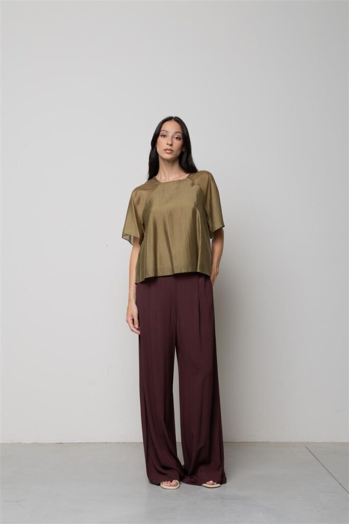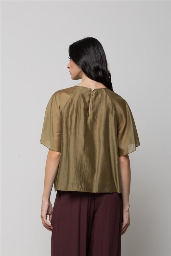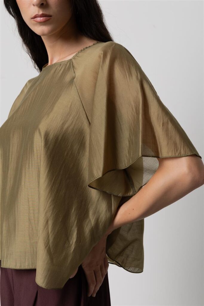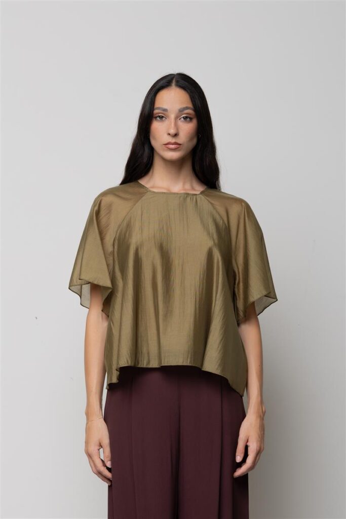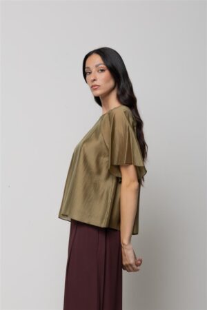 Itāļu modes zīmola KAOS viegli caurspīdīga paplatināta piegriezuma sieviešu blūze ar īsām piedurknēm haki zaļā tonī. Izgatavota no smalka un gaisīga liocela maisījuma materiāla. Papildināta ar īsām reglāna piedurknēm un slēptu pogas aizdari mugurpusē.
