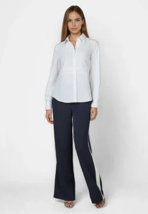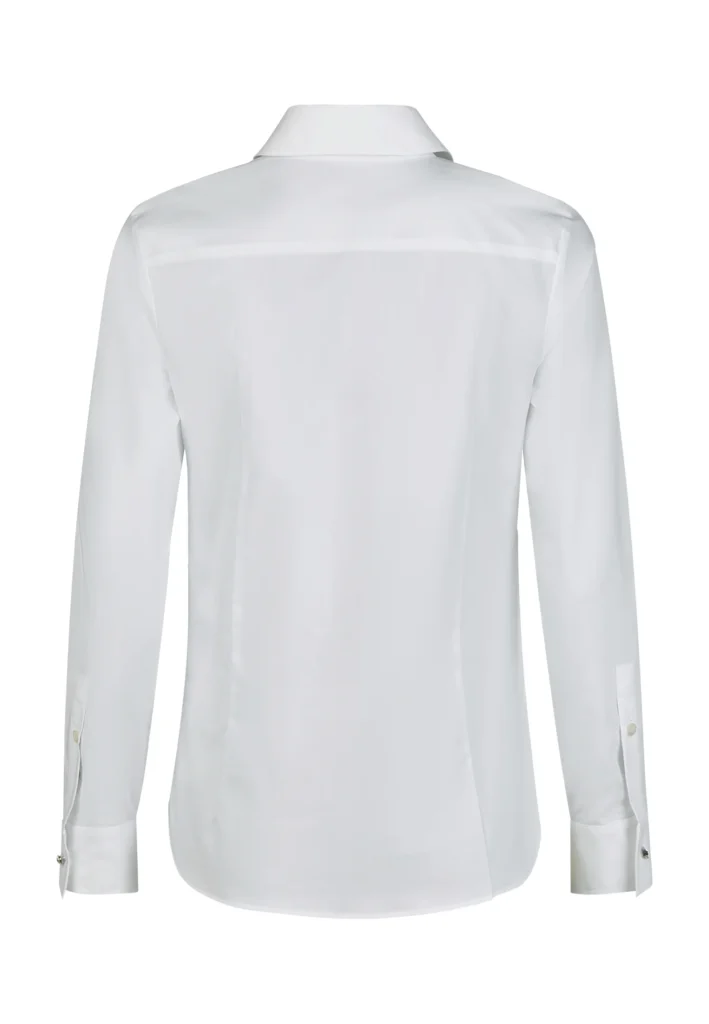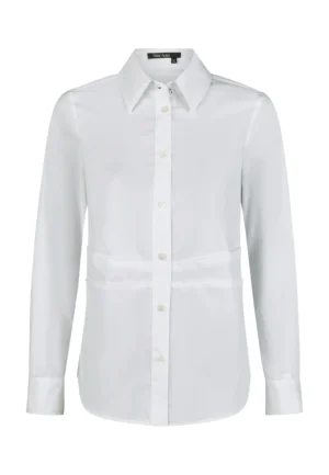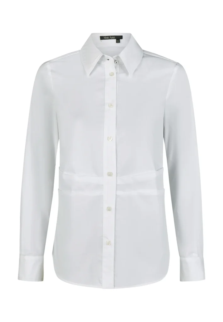 Vācu modes zīmola Marc Aurel balts viegli pieguļoša piegriezuma sieviešu krekls ar garām piedurknēm. Izgatavots no kokvilnas maisījuma materiāla ar poplīna tekstūru. Papildināts ar dekoratīvām ielocēm jostasvietā un noapaļotu apakšmalu. Akcentēts ar mirdzošām apkakles un aproču pogām.