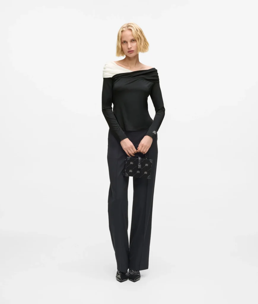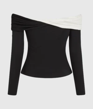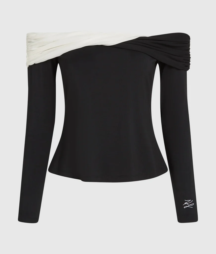 Vācu luksusa zīmola Karl Lagerfeld melns eleganta silueta sieviešu tops ar atkailinātu plecu daļu. Izgatavots no viegla un elastīga modāla un viskozes materiāla. Papildināts ar silikona lenti kakla izgriezuma iekšpusē. Akcentēts ar kontrastējošu drapējumu un autogrāfa izšuvumu aproces daļā.