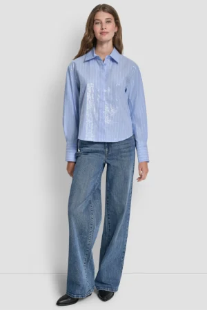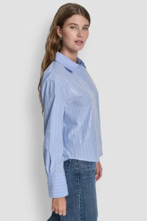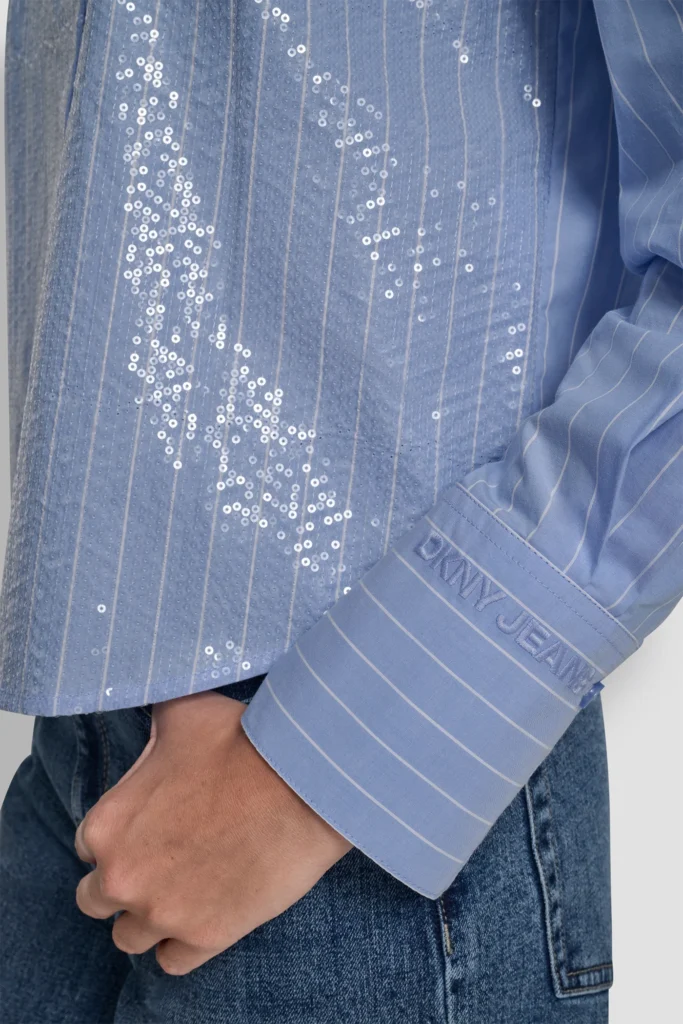 ASV modes zīmola DKNY lavandas zils sieviešu krekls ar smalku svītru rakstu un caurspīdīgu fliteru apdari priekšpusē. Izgatavots no 100% kokvilnas poplīna. Papildināts ar noapaļotu apakšmalu un zīmola logotipa izšuvumu uz aproces.