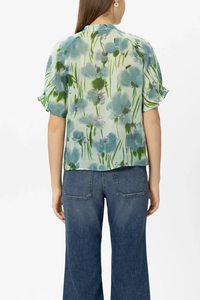 Vācu premium klases apģērbu zīmola Luisa Cerano gaiši zaļa sieviešu blūze ar grafisku ziedu apdruku. Izgatavota no viegla un daļēji caurspīdīga liocela un rāmijas auduma. Papildināta ar paaugstinātu apkaklīti un īsām reglāna piedurknēm, kā arī daļēji elastīgām aprocēm ar smalkām volānu detaļām.