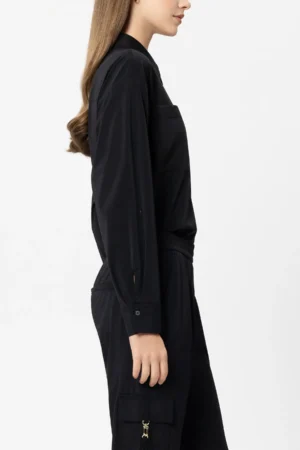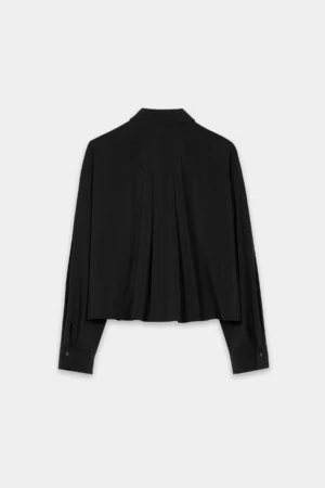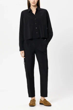 Vācu premium klases apģērbu zīmola Luisa Cerano saīsināta, plata piegriezuma sieviešu kreklblūze izteikti melnā krāsā. Izgatavota no plūstoša un elastīga materiāla ar vieglu satīna spīdumu. Papildināta ar uzšūtām krūšu kabatām un ielocēm mugurpusē.