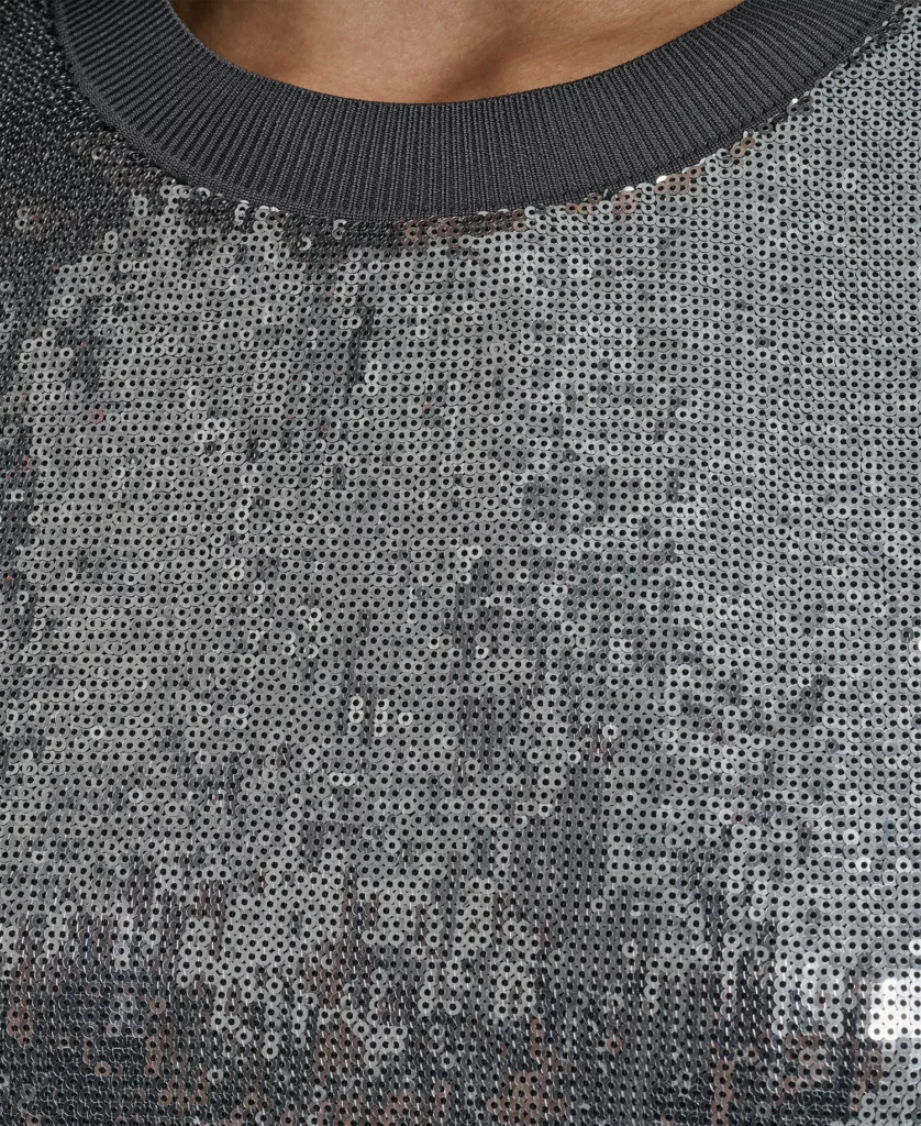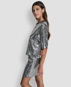 ASV modes zīmola DKNY mirdzošs sieviešu tops ar sudraba fliteru pārklājumu. Papildināts ar rievotu apkakles apdari un smalku zīmola emblēmu apakšmalā.